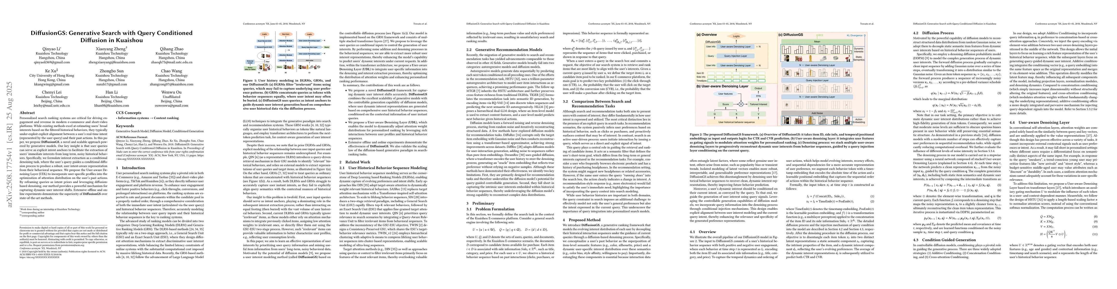 Personalized search ranking systems are critical for driving engagement and revenue in modern e-commerce and short-video platforms. While existing methods excel at estimating users' broad interests based on the filtered historical behaviors, they typically under-exploit explicit alignment between a user's real-time intent (represented by the user query) and their past actions. In this paper, we propose DiffusionGS, a novel and scalable approach powered by generative models. Our key insight is that user queries can serve as explicit intent anchors to facilitate the extraction of users' immediate interests from long-term, noisy historical behaviors. Specifically, we formulate interest extraction as a conditional denoising task, where the user's query guides a conditional diffusion process to produce a robust, user intent-aware representation from their behavioral sequence. We propose the User-aware Denoising Layer (UDL) to incorporate user-specific profiles into the optimization of attention distribution on the user's past actions. By reframing queries as intent priors and leveraging diffusion-based denoising, our method provides a powerful mechanism for capturing dynamic user interest shifts. Extensive offline and online experiments demonstrate the superiority of DiffusionGS over state-of-the-art methods.