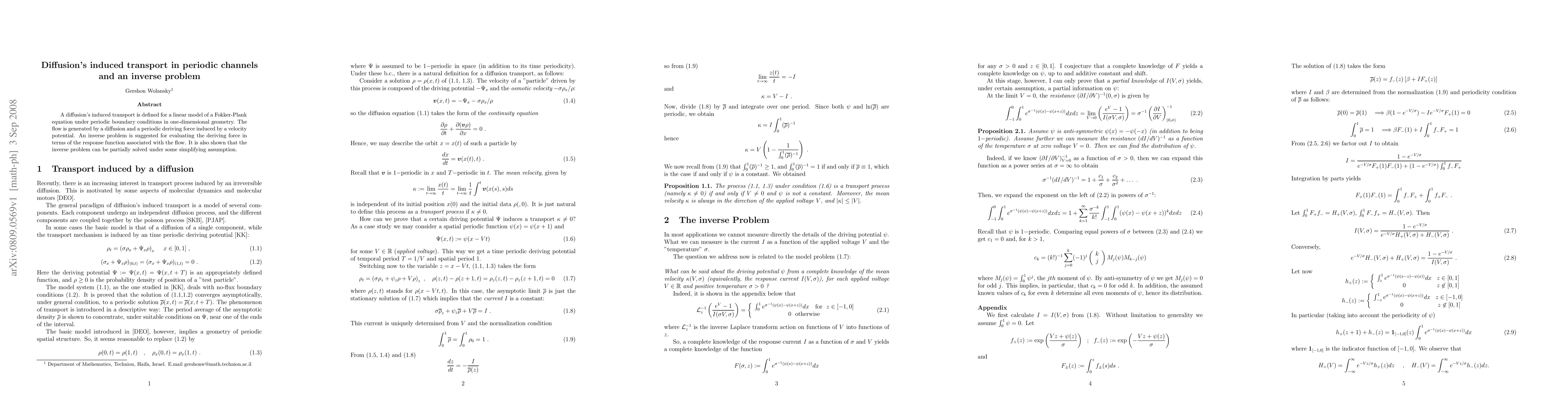 A diffusion's induced transport is defined for a linear model of a Fokker-Plank equation under periodic boundary conditions in one-dimensional geometry. The flow is generated by a diffusion and a periodic deriving force induced by a velocity potential. An inverse problem is suggested for evaluating the deriving force in terms of the response function associated with the flow. It is also shown that the inverse problem can be partially solved under some simplifying assumption.