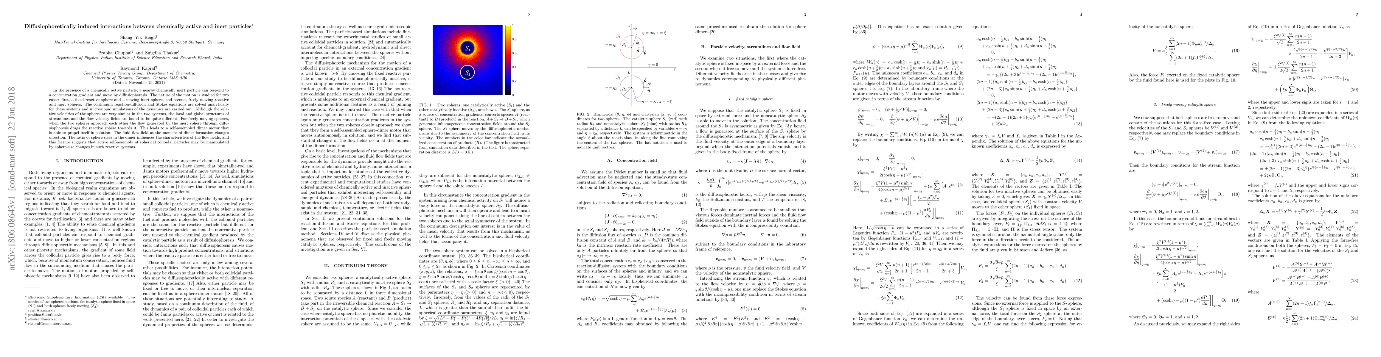 In the presence of a chemically active particle, a nearby chemically inert particle can respond to a concentration gradient and move by diffusiophoresis. The nature of the motion is studied for two cases: first, a fixed reactive sphere and a moving inert sphere, and second, freely moving reactive and inert spheres. The continuum reaction-diffusion and Stokes equations are solved analytically for these systems and microscopic simulations of the dynamics are carried out. Although the relative velocities of the spheres are very similar in the two systems, the local and global structures of streamlines and the flow velocity fields are found to be quite different. For freely moving spheres, when the two spheres approach each other the flow generated by the inert sphere through diffu- siophoresis drags the reactive sphere towards it. This leads to a self-assembled dimer motor that is able to propel itself in solution. The fluid flow field at the moment of dimer formation changes direction. The ratio of sphere sizes in the dimer influences the characteristics of the flow fields, and this feature suggests that active self-assembly of spherical colloidal particles may be manipulated by sphere-size changes in such reactive systems.
