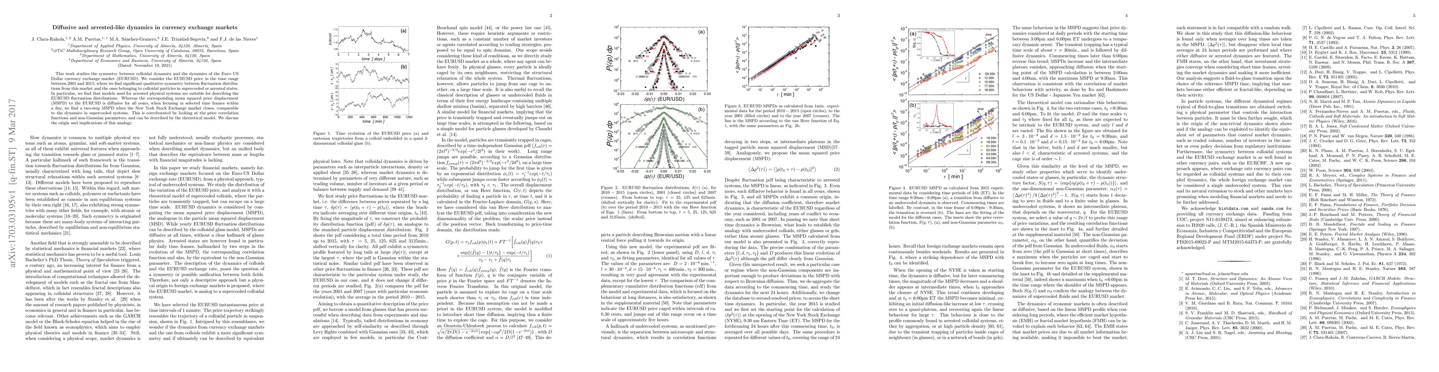 This work studies the symmetry between colloidal dynamics and the dynamics of the Euro--US Dollar currency exchange market (EURUSD). We consider the EURUSD price in the time range between 2001 and 2015, where we find significant qualitative symmetry between fluctuation distributions from this market and the ones belonging to colloidal particles in supercooled or arrested states. In particular, we find that models used for arrested physical systems are suitable for describing the EURUSD fluctuation distributions. Whereas the corresponding mean squared price displacement (MSPD) to the EURUSD is diffusive for all years, when focusing in selected time frames within a day, we find a two-step MSPD when the New York Stock Exchange market closes, comparable to the dynamics in supercooled systems. This is corroborated by looking at the price correlation functions and non-Gaussian parameters, and can be described by the theoretical model. We discuss the origin and implications of this analogy.