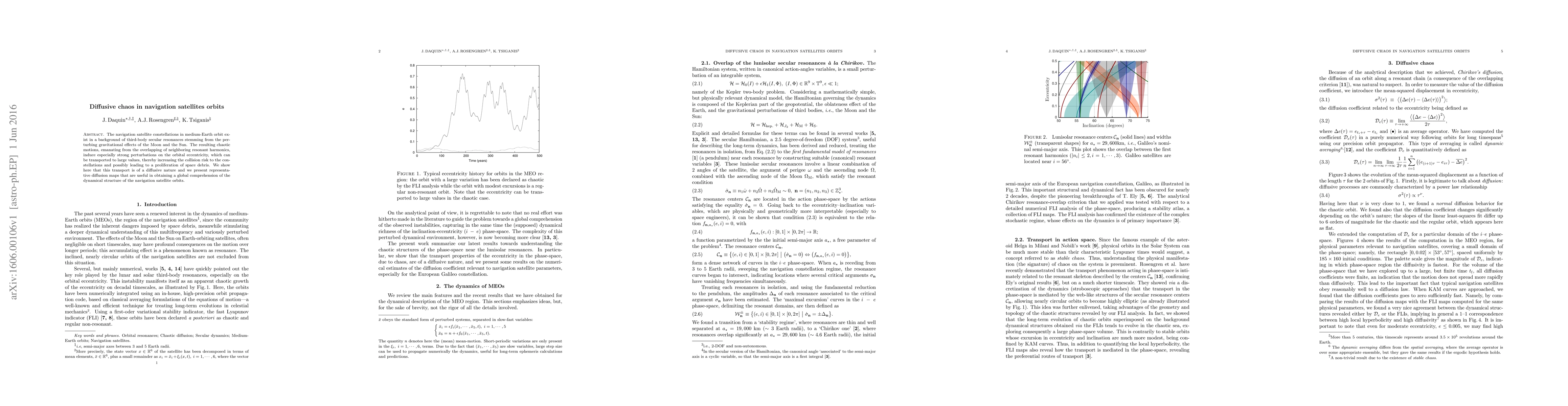 Navigation satellite orbits in medium-Earth orbit exhibit chaotic motions due to gravitational effects of the Moon and Sun, leading to increased collision risk and space debris.