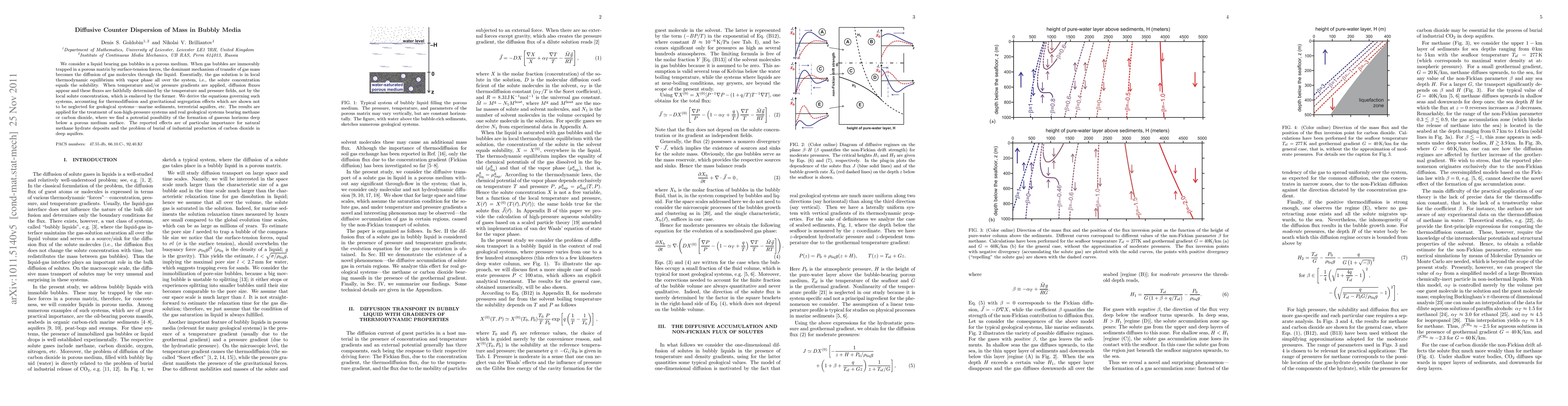 We consider a liquid bearing gas bubbles in a porous medium. When gas bubbles are immovably trapped in a porous matrix by surface-tension forces, the dominant mechanism of transfer of gas mass becomes the diffusion of gas molecules through the liquid. Essentially, the gas solution is in local thermodynamic equilibrium with vapor phase all over the system, i.e., the solute concentration equals the solubility. When temperature and/or pressure gradients are applied, diffusion fluxes appear and these fluxes are faithfully determined by the temperature and pressure fields, not by the local solute concentration, which is enslaved by the former. We derive the equations governing such systems, accounting for thermodiffusion and gravitational segregation effects which are shown not to be neglected for geological systems---marine sediments, terrestrial aquifers, etc. The results are applied for the treatment of non-high-pressure systems and real geological systems bearing methane or carbon dioxide, where we find a potential possibility of the formation of gaseous horizons deep below a porous medium surface. The reported effects are of particular importance for natural methane hydrate deposits and the problem of burial of industrial production of carbon dioxide in deep aquifers.