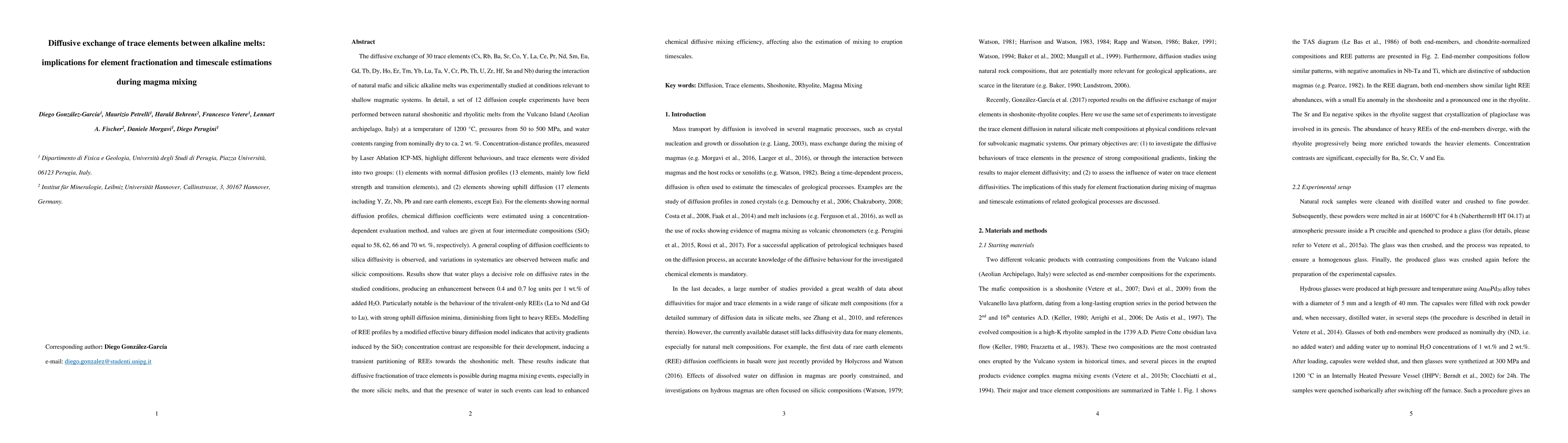 This study investigates the diffusive exchange of 30 trace elements between natural mafic and silicic alkaline melts, revealing distinct diffusion behaviors and the influence of water on diffusion rates. The research highlights the implications for element fractionation and magma mixing timescales.