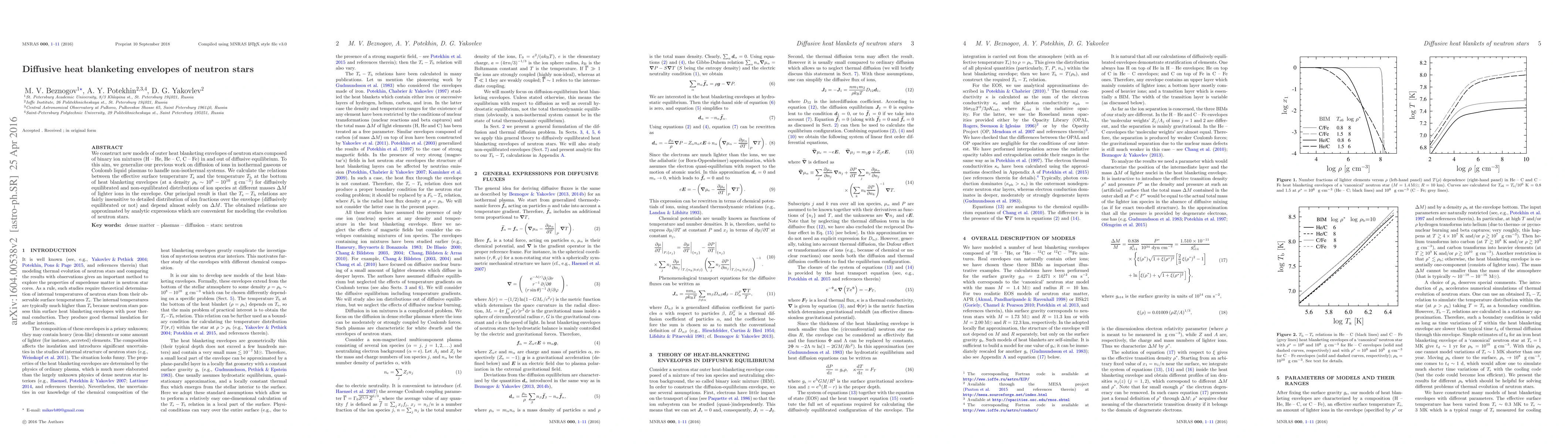 We construct new models of outer heat blanketing envelopes of neutron stars composed of binary ion mixtures (H - He, He - C, C - Fe) in and out of diffusive equilibrium. To this aim, we generalize our previous work on diffusion of ions in isothermal gaseous or Coulomb liquid plasmas to handle non-isothermal systems. We calculate the relations between the effective surface temperature Ts and the temperature Tb at the bottom of heat blanketing envelopes (at a density rhob= 1e8 -- 1e10 g/cc) for diffusively equilibrated and non-equilibrated distributions of ion species at different masses DeltaM of lighter ions in the envelope. Our principal result is that the Ts - Tb relations are fairly insensitive to detailed distribution of ion fractions over the envelope (diffusively equilibrated or not) and depend almost solely on DeltaM. The obtained relations are approximated by analytic expressions which are convenient for modeling the evolution of neutron stars.