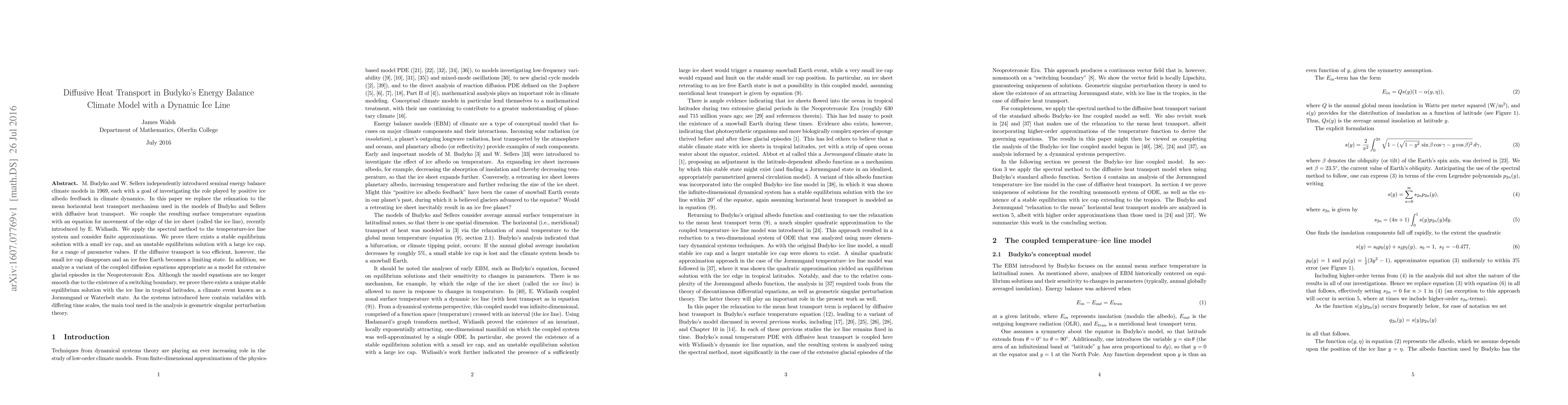 M. Budyko and W. Sellers independently introduced seminal energy balance climate models in 1969, each with a goal of investigating the role played by positive ice albedo feedback in climate dynamics. In this paper we replace the relaxation to the mean horizontal heat transport mechanism used in the models of Budyko and Sellers with diffusive heat transport. We couple the resulting surface temperature equation with an equation for movement of the edge of the ice sheet (called the ice line), recently introduced by E. Widiasih. We apply the spectral method to the temperature-ice line system and consider finite approximations. We prove there exists a stable equilibrium solution with a small ice cap, and an unstable equilibrium solution with a large ice cap, for a range of parameter values. If the diffusive transport is too efficient, however, the small ice cap disappears and an ice free Earth becomes a limiting state. In addition, we analyze a variant of the coupled diffusion equations appropriate as a model for extensive glacial episodes in the Neoproterozoic Era. Although the model equations are no longer smooth due to the existence of a switching boundary, we prove there exists a unique stable equilibrium solution with the ice line in tropical latitudes, a climate event known as a Jormungand or Waterbelt state. As the systems introduced here contain variables with differing time scales, the main tool used in the analysis is geometric singular perturbation theory.