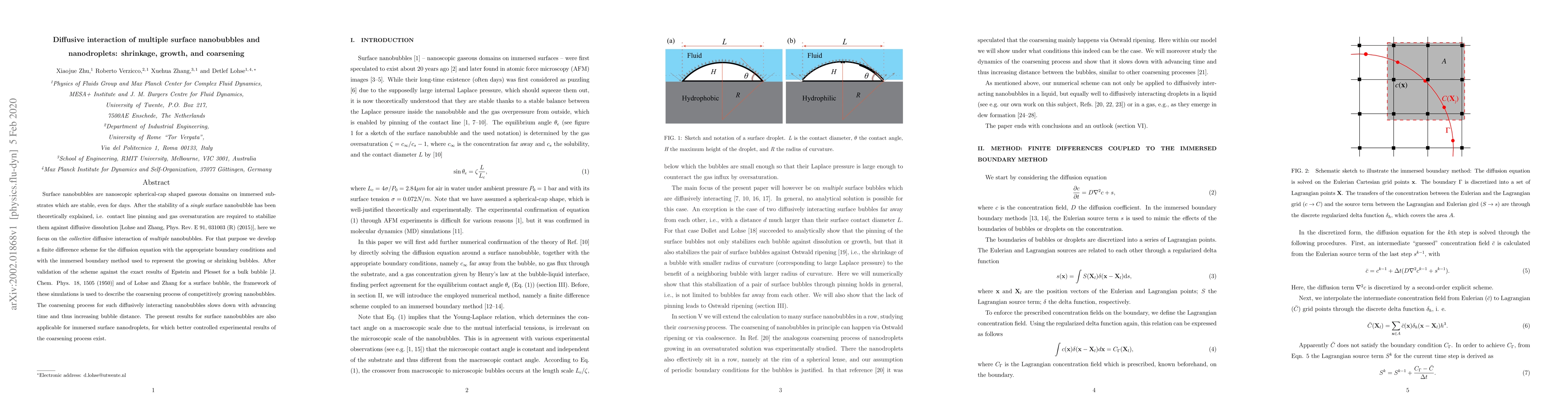 This paper develops a numerical scheme to study the collective diffusive interactions of multiple surface nanobubbles, focusing on their shrinkage, growth, and coarsening. The framework is validated against established results for single bubbles and then used to demonstrate that the coarsening process slows down over time as bubble distances increase. The findings are also applicable to surface nanodroplets.