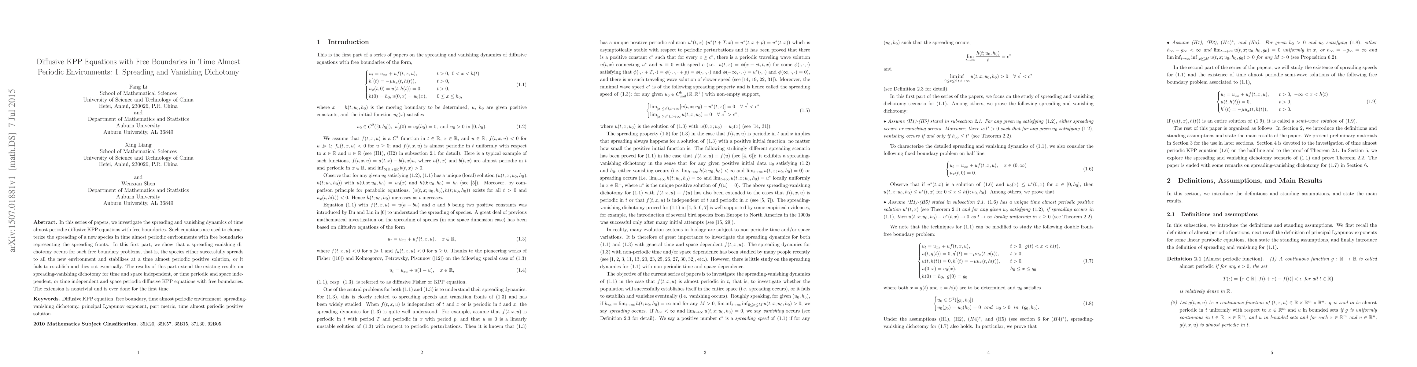 In this series of papers, we investigate the spreading and vanishing dynamics of time almost periodic diffusive KPP equations with free boundaries. Such equations are used to characterize the spreading of a new species in time almost periodic environments with free boundaries representing the spreading fronts. In this first part, we show that a spreading-vanishing dichotomy occurs for such free boundary problems, that is, the species either successfully spreads to all the new environment and stabilizes at a time almost periodic positive solution, or it fails to establish and dies out eventually. The results of this part extend the existing results on spreading-vanishing dichotomy for time and space independent, or time periodic and space independent, or time independent and space periodic diffusive KPP equations with free boundaries. The extension is nontrivial and is ever done for the first time.