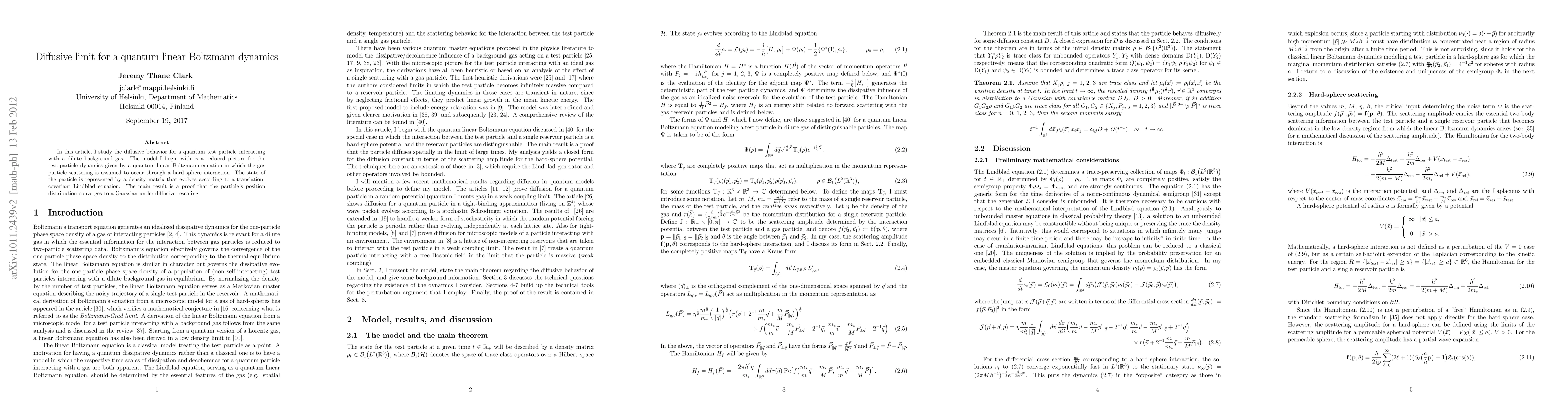 In this article, I study the diffusive behavior for a quantum test particle interacting with a dilute background gas. The model I begin with is a reduced picture for the test particle dynamics given by a quantum linear Boltzmann equation in which the gas particle scattering is assumed to occur through a hard-sphere interaction. The state of the particle is represented by a density matrix that evolves according to a translation-covariant Lindblad equation. The main result is a proof that the particle's position distribution converges to a Gaussian under diffusive rescaling.