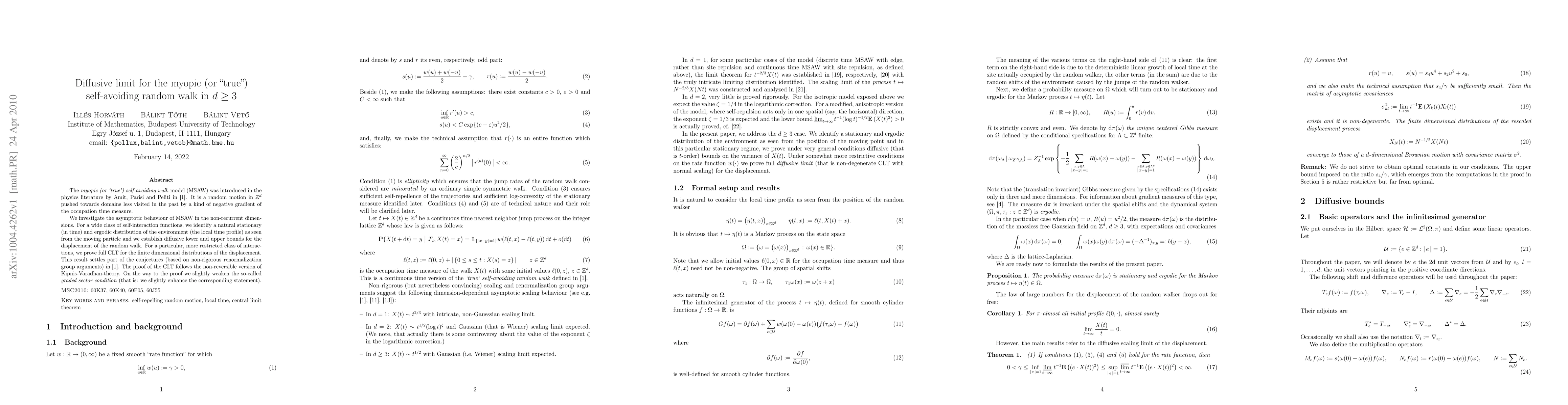 This paper investigates the asymptotic behavior of the myopic self-avoiding walk (MSAW) in dimensions three and higher, establishing diffusive bounds for its displacement and proving a central limit theorem (CLT) for a specific class of interactions. The findings confirm conjectures from earlier work and utilize a modified version of the Kipnis-Varadhan theory.