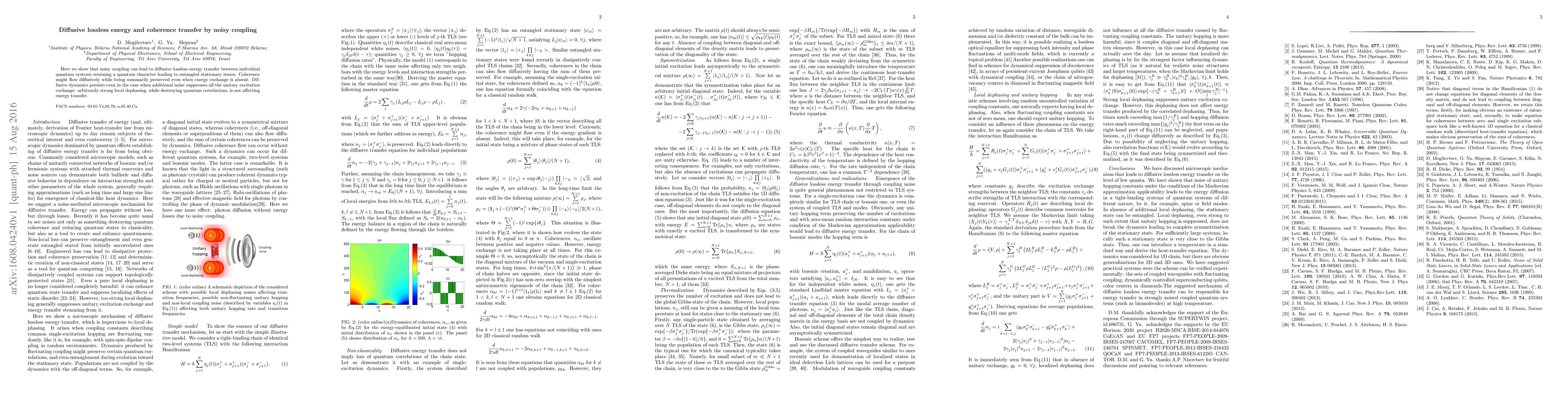Here we show that noisy coupling can lead to diffusive lossless energy transfer between individual quantum systems retaining a quantum character leading to entangled stationary states. Coherence might flow diffusively while being summarily preserved even when energy exchange is absent. Diffusive dynamics persists even in the case when additional noise suppresses all the unitary excitation exchange: arbitrarily strong local dephasing, while destroying quantum correlations, is not affecting energy transfer.