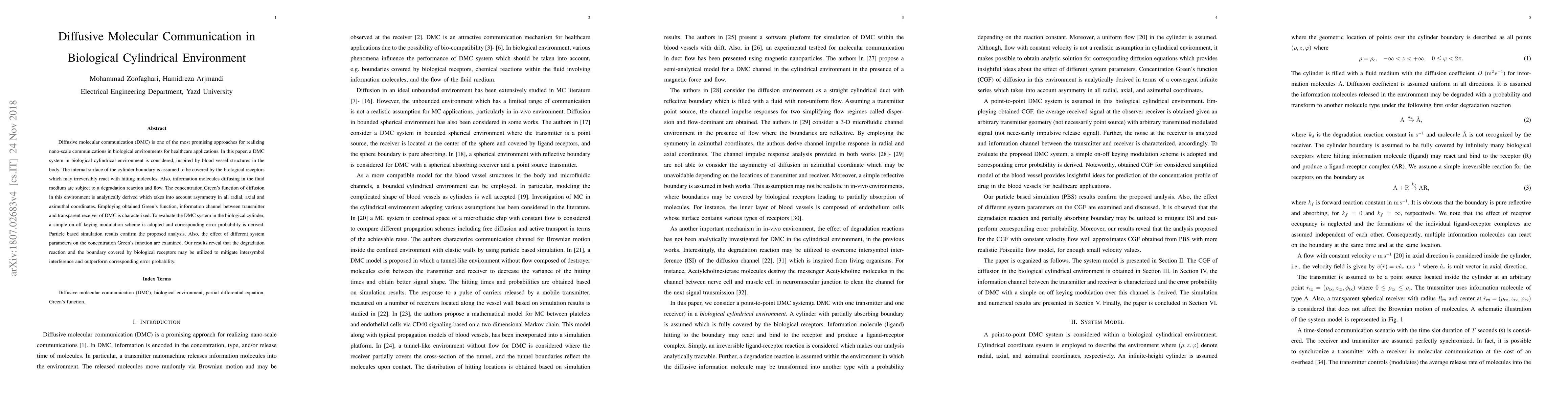 This paper explores diffusive molecular communication (DMC) in a biological cylindrical environment, analogous to blood vessels, where molecules face degradation and irreversible reactions with biological receptors. Analytical derivation of the concentration Green's function accounts for asymmetric diffusion, and simulation results confirm that degradation and receptor coverage can mitigate intersymbol interference and improve error probability.
