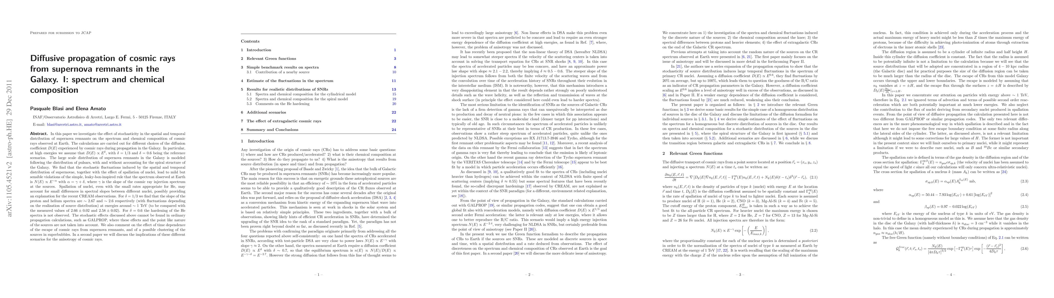 In this paper we investigate the effect of stochasticity in the spatial and temporal distribution of supernova remnants on the spectrum and chemical composition of cosmic rays observed at Earth. The calculations are carried out for different choices of the diffusion coefficient D(E) experienced by cosmic rays during propagation in the Galaxy. In particular, at high energies we assume that D(E)\sim E^{\delta}, with $\delta=1/3$ and $\delta=0.6$ being the reference scenarios. The large scale distribution of supernova remnants in the Galaxy is modeled following the distribution of pulsars, with and without accounting for the spiral structure of the Galaxy. We find that the stochastic fluctuations induced by the spatial and temporal distribution of supernovae, together with the effect of spallation of nuclei, lead to mild but sensible violations of the simple, leaky-box-inspired rule that the spectrum observed at Earth is $N(E)\propto E^{-\alpha}$ with $\alpha=\gamma+\delta$, where $\gamma$ is the slope of the cosmic ray injection spectrum at the sources. Spallation of nuclei, even with the small rates appropriate for He, may account for slight differences in spectral slopes between different nuclei, providing a possible explanation for the recent CREAM observations. For $\delta=1/3$ we find that the slope of the proton and helium spectra are $\sim 2.67$ and $\sim 2.6$ respectively at energies above 1 TeV (to be compared with the measured values of $2.66\pm 0.02$ and $2.58\pm 0.02$). For $\delta=0.6$ the hardening of the He spectra is not observed. We also comment on the effect of time dependence of the escape of cosmic rays from supernova remnants, and of a possible clustering of the sources in superbubbles. In a second paper we will discuss the implications of these different scenarios for the anisotropy of cosmic rays.