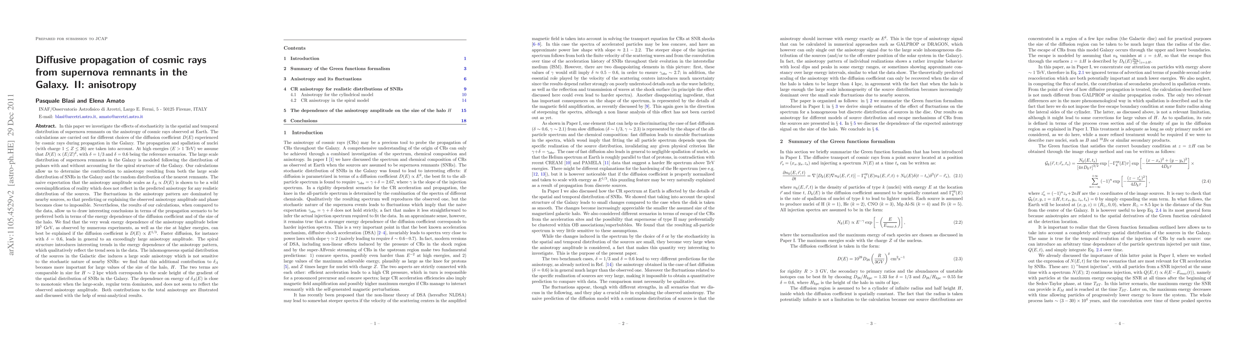We investigate the effects of stochasticity in the spatial and temporal distribution of supernova remnants on the anisotropy of cosmic rays observed at Earth. The calculations are carried out for different choices of the diffusion coefficient D(E) for propagation in the Galaxy. The propagation and spallation of nuclei are taken into account. At high energies we assume that $D(E)\sim(E/Z)^{\delta}$, with $\delta=1/3$ and $\delta=0.6$ being the reference scenarios. The large scale distribution of supernova remnants in the Galaxy is modeled following the distribution of pulsars with and without accounting for the spiral structure of the Galaxy. Our calculations allow us to determine the contribution to anisotropy resulting from both the large scale distribution of SNRs in the Galaxy and the random distribution of the nearest remnants. The naive expectation that the anisotropy amplitude scales as D(E) is shown to be an oversimplification which does not reflect in the predicted anisotropy for any realistic distribution of the sources. The fluctuations in the anisotropy pattern are dominated by nearby sources, so that predicting or explaining the observed anisotropy amplitude and phase becomes close to impossible. We find however that the very weak energy dependence of the anisotropy amplitude below $10^{5}$ GeV and the rise at higher energies, can best be explained if the diffusion coefficient is $D(E)\sim E^{1/3}$. Faster diffusion, for instance with $\delta=0.6$, leads in general to an exceedingly large anisotropy amplitude. The spiral structure introduces interesting trends in the energy dependence of the anisotropy pattern, which qualitatively reflect the trend seen in the data. For large values of the halo size we find that the anisotropy becomes dominated by the large scale regular structure of the source distribution, leading indeed to a monotonic increase of $\delta_A$ with energy.
