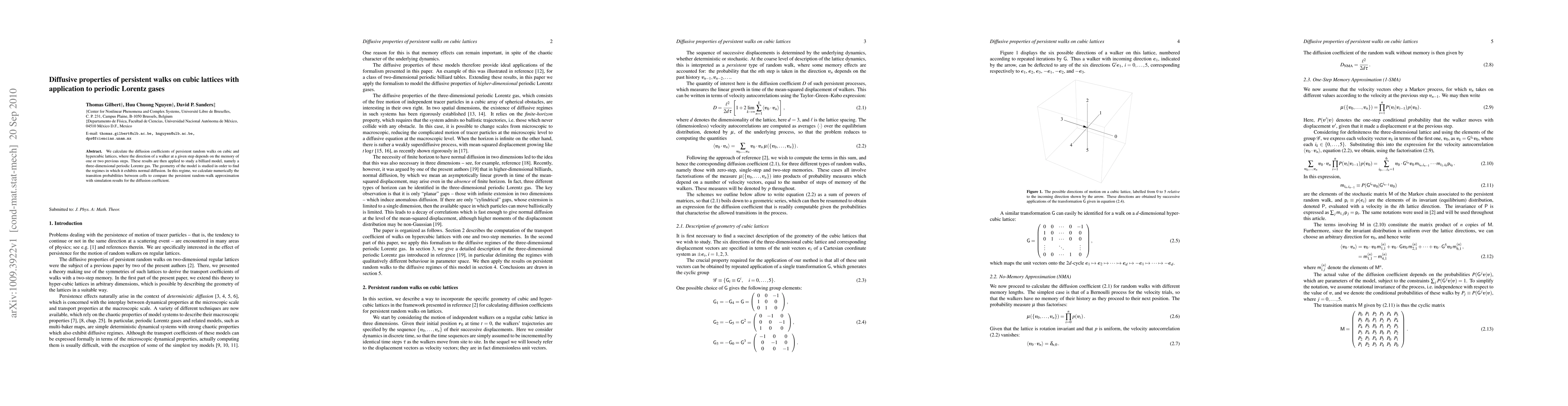 This paper calculates diffusion coefficients for persistent random walks on cubic and hypercubic lattices, where walker direction depends on memory of previous steps. It applies these findings to a three-dimensional periodic Lorentz gas model, identifying regimes of normal diffusion and comparing persistent random-walk approximations with simulation results.