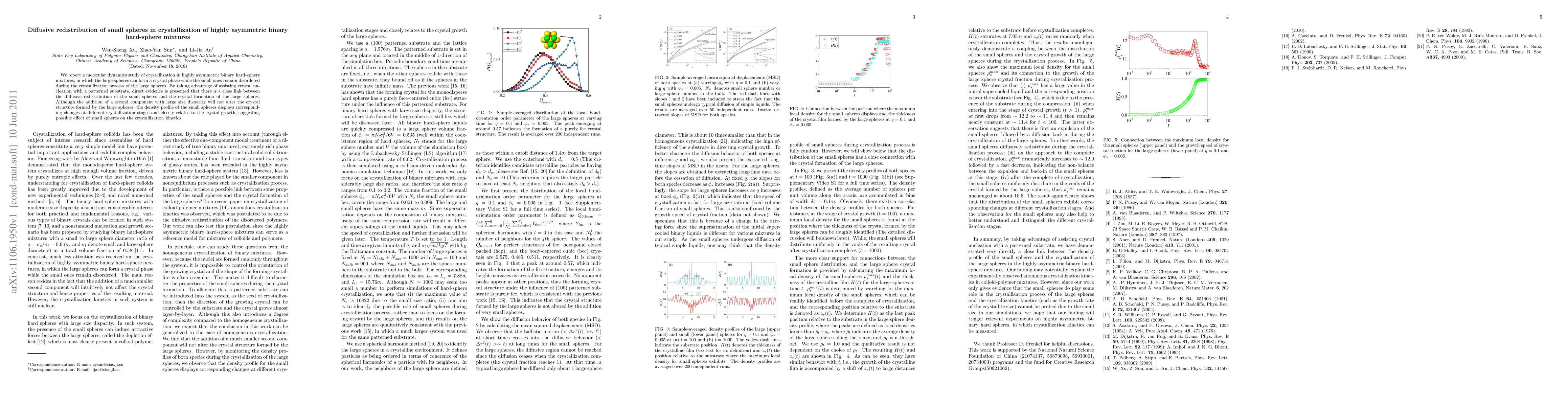 We report a molecular dynamics study of crystallization in highly asymmetric binary hard-sphere mixtures, in which the large spheres can form a crystal phase while the small ones remain disordered during the crystallization process of the large spheres. By taking advantage of assisting crystal nucleation with a patterned substrate, direct evidence is presented that there is a close link between the diffusive redistribution of the small spheres and the crystal formation of the large spheres. Although the addition of a second component with large size disparity will not alter the crystal structure formed by the large spheres, the density profile of the small spheres displays corresponding changes at different crystallization stages and closely relates to the crystal growth, suggesting possible effect of small spheres on the crystallization kinetics.