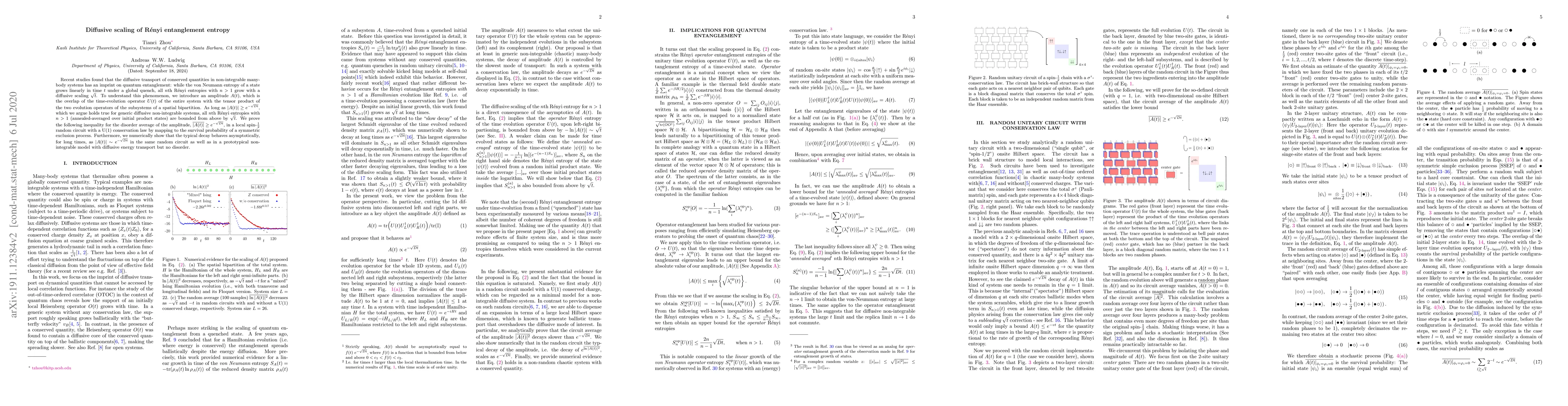 Recent studies found that the diffusive transport of conserved quantities in non-integrable many-body systems has an imprint on quantum entanglement: while the von Neumann entropy of a state grows linearly in time $t$ under a global quench, all $n$th R\'enyi entropies with $n > 1$ grow with a diffusive scaling $\sqrt{t}$. To understand this phenomenon, we introduce an amplitude $A(t)$, which is the overlap of the time-evolution operator $U(t)$ of the entire system with the tensor product of the two evolution operators of the subsystems of a spatial bipartition. As long as $|A(t)| \ge e^{-\sqrt{Dt}}$, which we argue holds true for generic diffusive non-integrable systems, all $n$th R\'enyi entropies with $n >1$ (annealed-averaged over initial product states) are bounded from above by $\sqrt{t}$. We prove the following inequality for the disorder average of the amplitude, $\overline{|A(t)|} \ge e^{ - \sqrt{Dt}} $, in a local spin-$\frac{1}{2}$ random circuit with a $\text{U}(1)$ conservation law by mapping to the survival probability of a symmetric exclusion process. Furthermore, we numerically show that the typical decay behaves asymptotically, for long times, as $|A(t)| \sim e^{ - \sqrt{Dt}} $ in the same random circuit as well as in a prototypical non-integrable model with diffusive energy transport but no disorder.