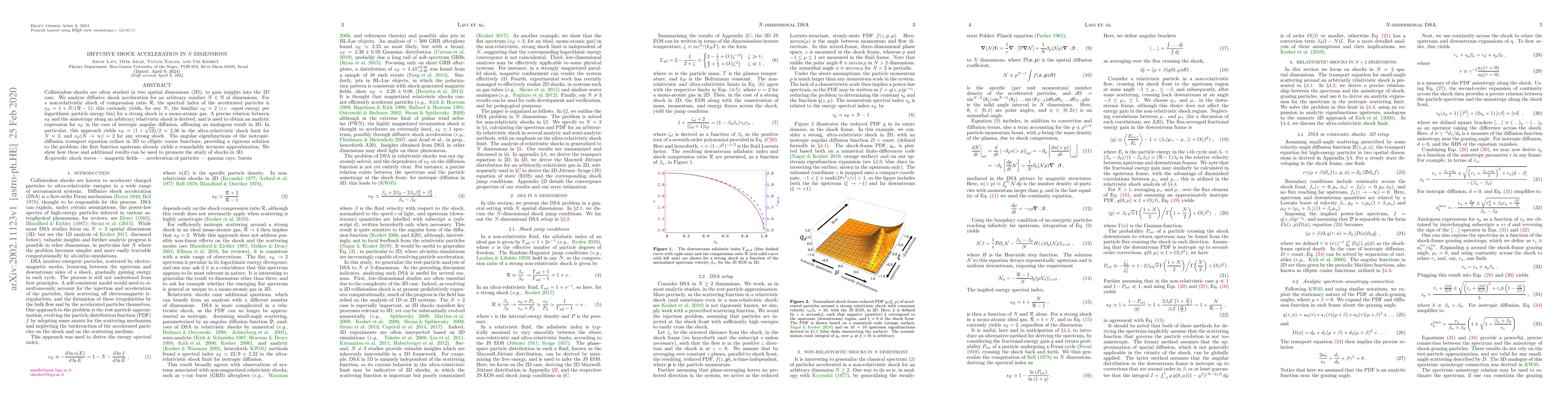 The paper explores Diffusive Shock Acceleration (DSA) in N dimensions, deriving spectral indices for various dimensions. It confirms that for any N, a strong shock in a mono-atomic gas results in a spectral index of 2. The study also provides an analytic expression for the spectral index in the case of isotropic angular diffusion, and offers a rigorous solution for 2D shocks using elliptic cosine functions. The findings are suggested to enhance the understanding and study of 3D shocks.