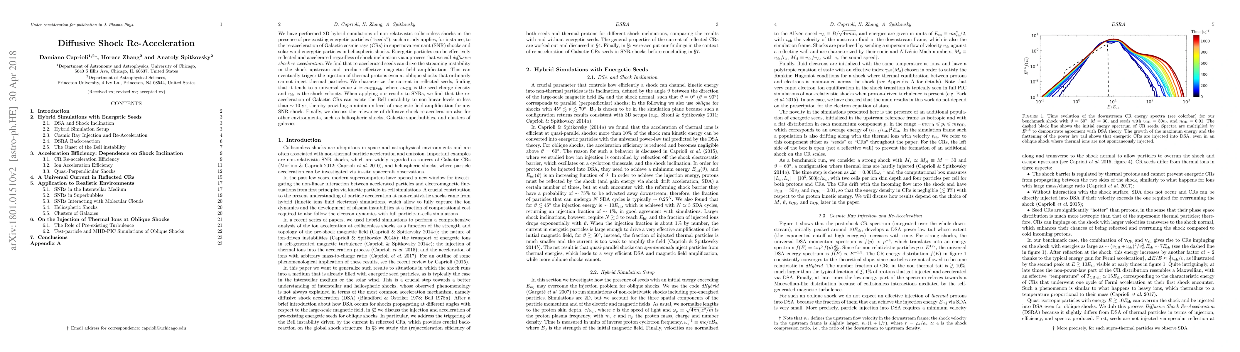 We have performed 2D hybrid simulations of non-relativistic collisionless shocks in the presence of pre-existing energetic particles ("seeds"); such a study applies, for instance, to the re-acceleration of Galactic cosmic rays (CRs) in supernova remnant (SNR) shocks and solar wind energetic particles in heliospheric shocks. Energetic particles can be effectively reflected and accelerated regardless of shock inclination via a process that we call \emph{diffusive shock re-acceleration}. We find that reaccelerated seeds can drive the streaming instability in the shock upstream and produce effective magnetic field amplification. This can eventually trigger the injection of thermal protons even at oblique shocks that ordinarily cannot inject thermal particles. We characterize the current in reflected seeds, finding that it tends to a universal value $J\simeq e n_{cr} v_{sh}$, where $e n_{cr}$ is the seed charge density and $v_{sh}$ is the shock velocity. When applying our results to SNRs, we find that the re-acceleration of Galactic CRs can excite the Bell instability to non-linear levels in less than $\sim 10$ yr, thereby providing a minimum level of magnetic field amplification for any SNR shock. Finally, we discuss the relevance of diffusive shock re-acceleration also for other environments, such as heliospheric shocks, Galactic superbubbles, and clusters of galaxies.