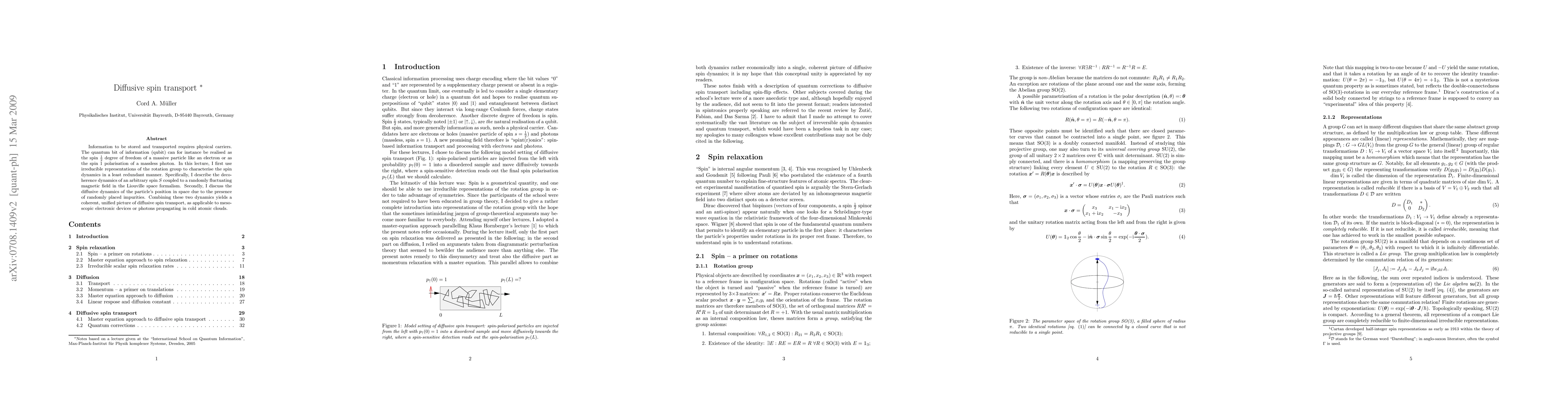 Information to be stored and transported requires physical carriers. The quantum bit of information (qubit) can for instance be realised as the spin 1/2 degree of freedom of a massive particle like an electron or as the spin 1 polarisation of a massless photon. In this lecture, I first use irreducible representations of the rotation group to characterise the spin dynamics in a least redundant manner. Specifically, I describe the decoherence dynamics of an arbitrary spin S coupled to a randomly fluctuating magnetic field in the Liouville space formalism. Secondly, I discuss the diffusive dynamics of the particle's position in space due to the presence of randomly placed impurities. Combining these two dynamics yields a coherent, unified picture of diffusive spin transport, as applicable to mesoscopic electronic devices or photons propagating in cold atomic clouds.