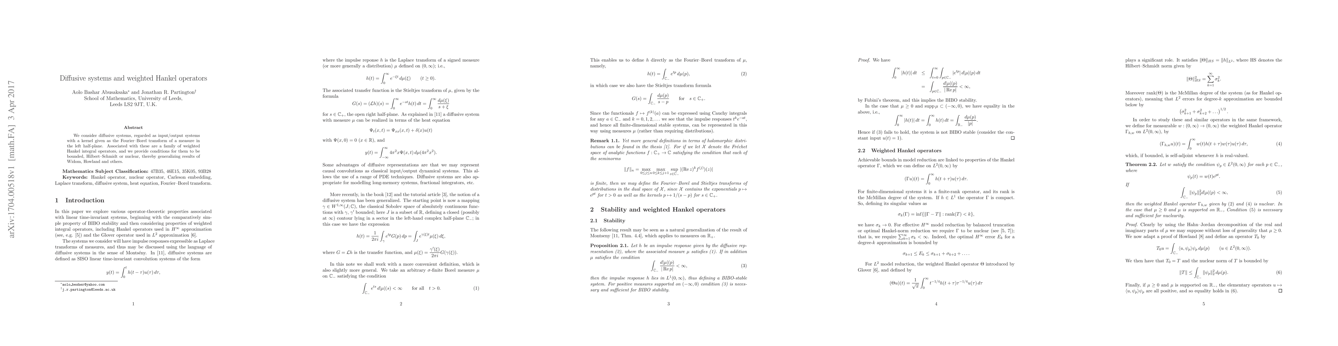 We consider diffusive systems, regarded as input/output systems with a kernel given as the Fourier--Borel transform of a measure in the left half-plane. Associated with these are a family of weighted Hankel integral operators, and we provide conditions for them to be bounded, Hilbert--Schmidt or nuclear, thereby generalizing results of Widom, Howland and others.
