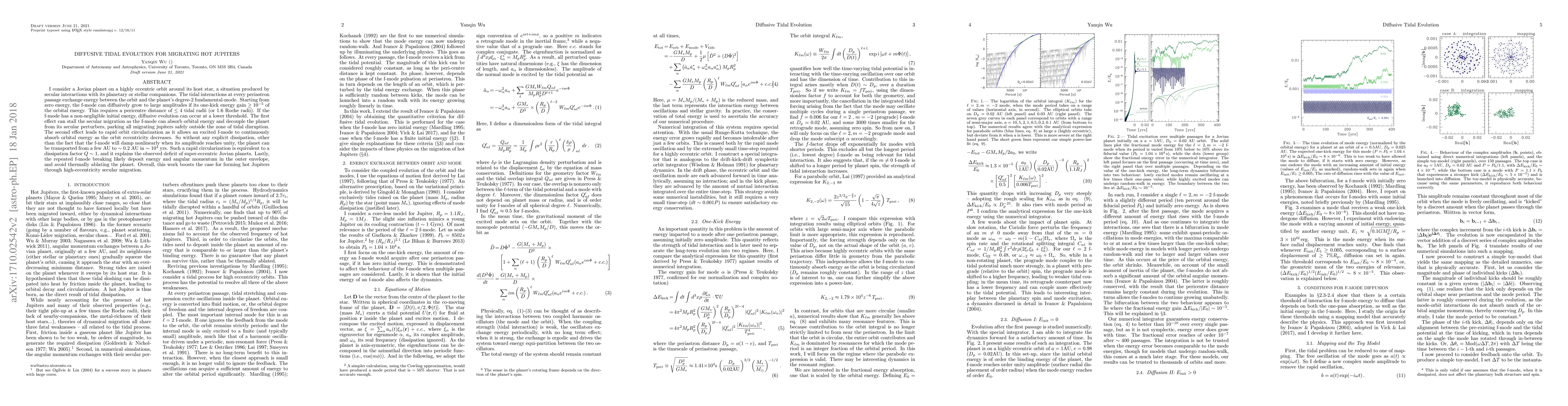 I consider a Jovian planet on a highly eccentric orbit around its host star, a situation produced by secular interactions with its planetary or stellar companions. The tidal interactions at every periastron passage exchange energy between the orbit and the planet's degree-2 fundamental-mode. Starting from zero energy, the f-mode can diffusively grow to large amplitudes if its one-kick energy gain > 10^-5 of the orbital energy. This requires a pericentre distance of < 4 tidal radii (or 1.6 Roche radii). If the f-mode has a non-negligible initial energy, diffusive evolution can occur at a lower threshold. The first effect can stall the secular migration as the f-mode can absorb orbital energy and decouple the planet from its secular perturbers, parking all migrating jupiters safely outside the zone of tidal disruption. The second effect leads to rapid orbit circularization as it allows an excited f-mode to continuously absorb orbital energy as the orbit eccentricity decreases. So without any explicit dissipation, other than the fact that the f-mode will damp nonlinearly when its amplitude reaches unity, the planet can be transported from a few AU to ~ 0.2 AU in ~ 10^4 yrs. Such a rapid circularization is equivalent to a dissipation factor Q ~ 1, and it explains the observed deficit of super-eccentric Jovian planets. Lastly, the repeated f-mode breaking likely deposit energy and angular momentum in the outer envelope, and avoid thermally ablating the planet. Overall, this work boosts the case for forming hot Jupiters through high-eccentricity secular migration.