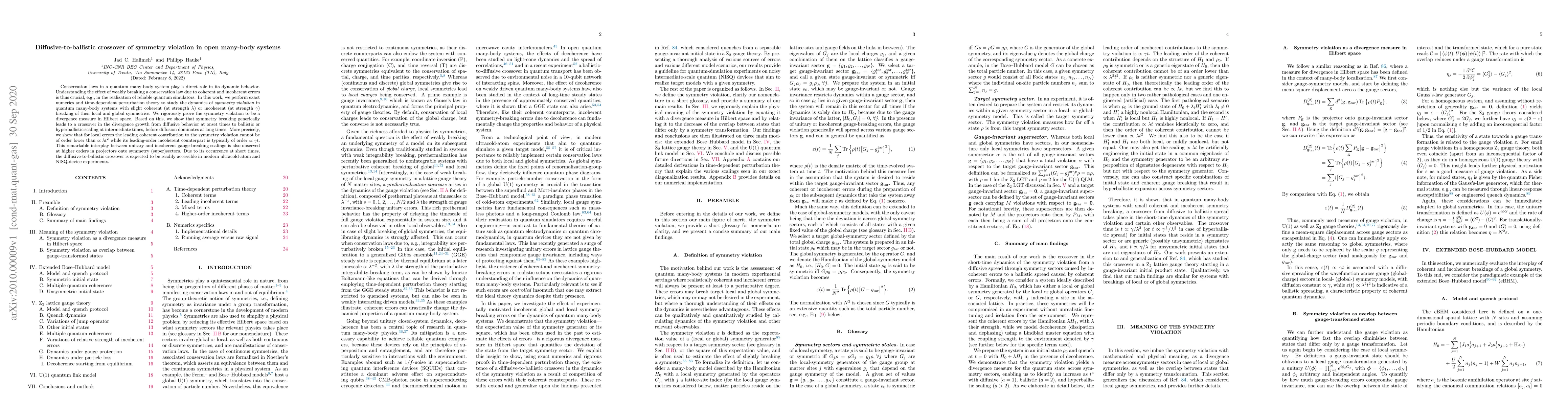 Conservation laws in a quantum many-body system play a direct role in its dynamic behavior. Understanding the effect of weakly breaking a conservation law due to coherent and incoherent errors is thus crucial, e.g., in the realization of reliable quantum simulators. In this work, we perform exact numerics and time-dependent perturbation theory to study the dynamics of \textit{symmetry violation} in quantum many-body systems with slight coherent (at strength $\lambda$) or incoherent (at strength $\gamma$) breaking of their local and global symmetries. We rigorously prove the symmetry violation to be a divergence measure in Hilbert space. Based on this, we show that symmetry breaking generically leads to a crossover in the divergence growth from diffusive behavior at onset times to ballistic or hyperballistic scaling at intermediate times, before diffusion dominates at long times. More precisely, we show that for local errors the leading coherent contribution to the symmetry violation cannot be of order lower than $\propto\lambda t^2$ while its leading-order incoherent counterpart is typically of order $\propto\gamma t$. This remarkable interplay between unitary and incoherent gauge-breaking scalings is also observed at higher orders in projectors onto symmetry (super)sectors. Due to its occurrence at short times, the diffusive-to-ballistic crossover is expected to be readily accessible in modern ultracold-atom and NISQ-device experiments.