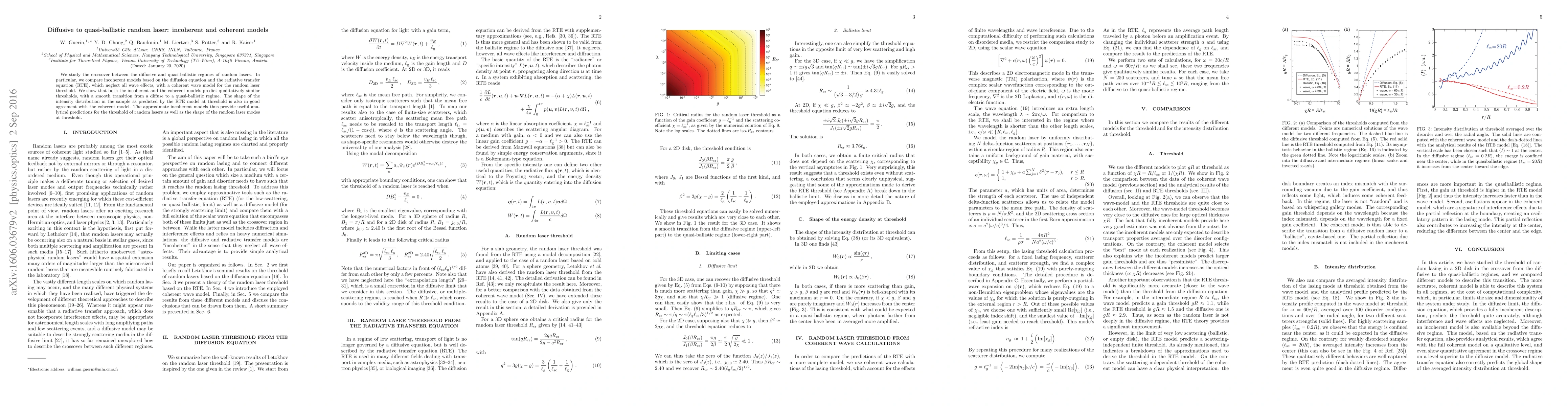 This paper investigates the transition from diffusive to quasi-ballistic behavior in random lasers, comparing incoherent models based on the diffusion and radiative transfer equations with a coherent wave model. Both types of models predict similar thresholds and intensity distributions, indicating that approximate incoherent models can effectively predict random laser behavior.