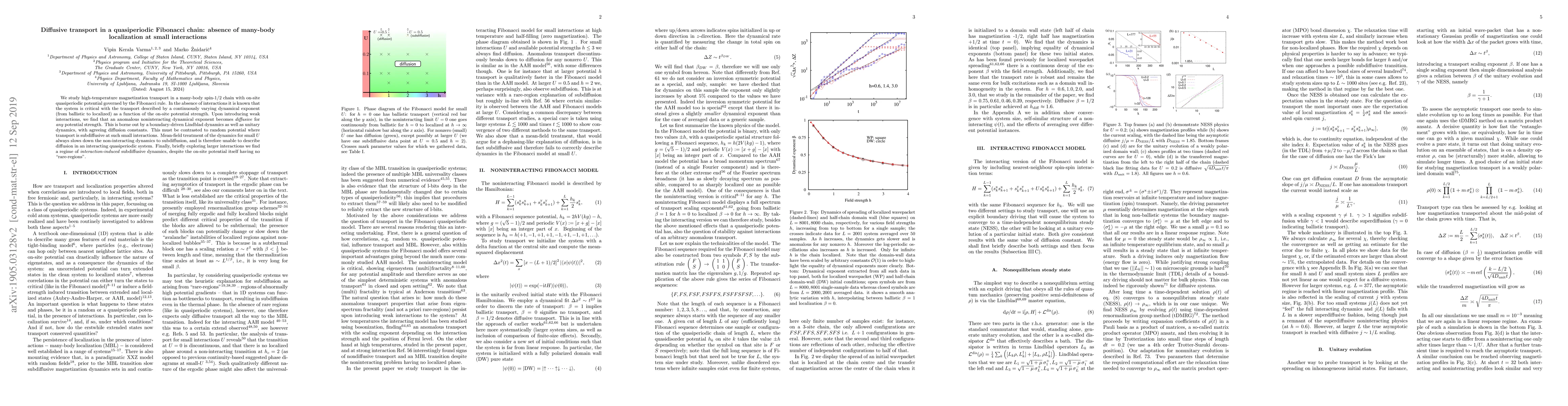 This paper investigates magnetization transport in a quasiperiodic Fibonacci spin-1/2 chain, revealing that weak interactions lead to diffusive transport, contrasting with subdiffusive transport in random potential systems. The study finds that mean-field approaches fail to capture the diffusive behavior in interacting quasiperiodic systems.
