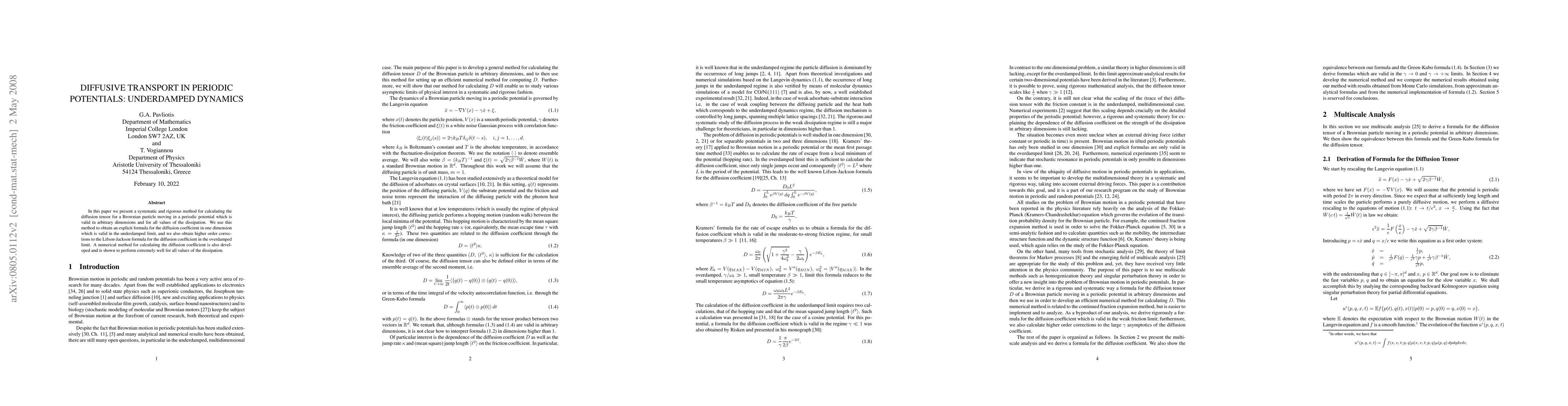 This paper develops a rigorous method for calculating the diffusion tensor in periodic potentials, providing an explicit formula for the diffusion coefficient in one dimension under the underdamped regime and higher-order corrections for the overdamped regime. A numerical method is also introduced, demonstrating high accuracy across all dissipation values.