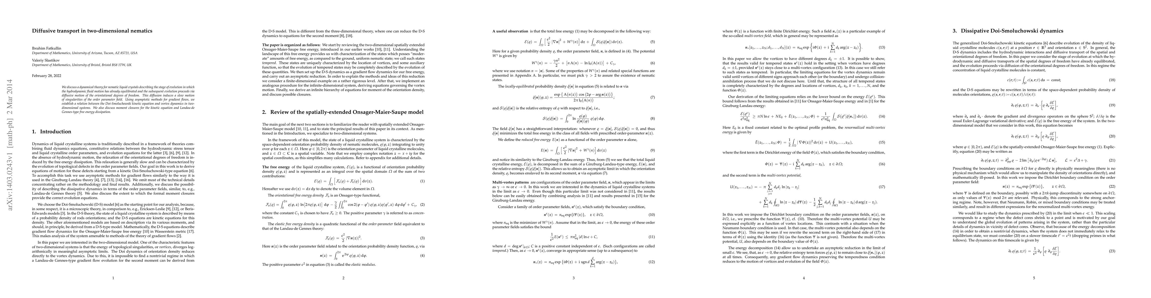 We discuss a dynamical theory for nematic liquid crystals describing the stage of evolution in which the hydrodynamic fluid motion has already equilibrated and the subsequent evolution proceeds via diffusive motion of the orientational degrees of freedom. This diffusion induces a slow motion of singularities of the order parameter field. Using asymptotic methods for gradient flows, we establish a relation between the Doi-Smoluchowski kinetic equation and vortex dynamics in two-dimensional systems. We also discuss moment closures for the kinetic equation and Landau-de Gennes-type free energy dissipation.