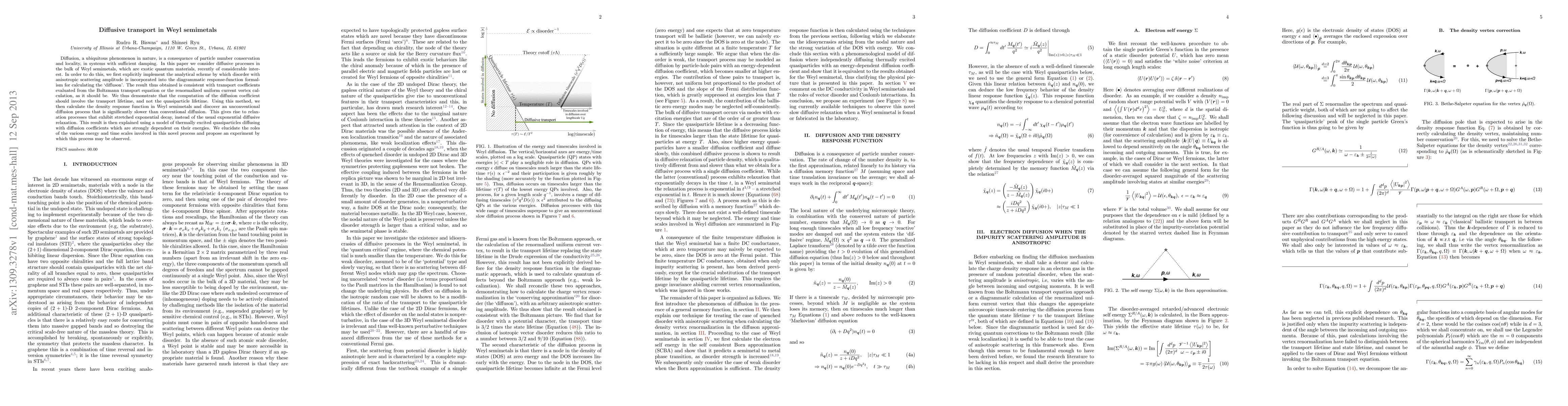 This research paper explores diffusion in Weyl semimetals, finding an unconventional diffusion process slower than typical diffusion. The method involves calculating the diffuson using an analytical scheme for anisotropic scattering disorder, leading to stretched exponential decay instead of standard exponential decay. The findings suggest novel relaxation processes with energy-dependent diffusion coefficients, proposing an experiment for observation.