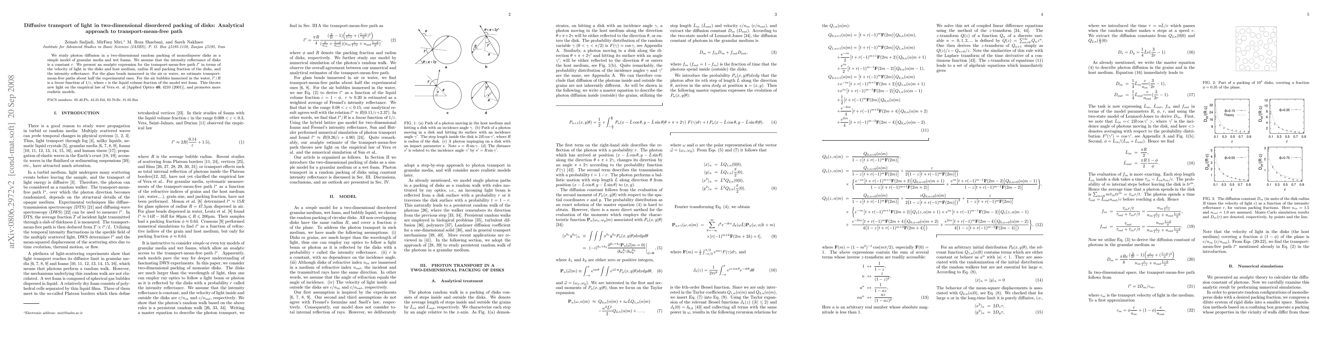 This paper analytically models photon diffusion in a two-dimensional disordered packing of disks, deriving a formula for the transport-mean-free path based on disk properties and reflectance. The model's predictions for glass beads and air bubbles in water show discrepancies with experimental data, suggesting room for improved modeling.