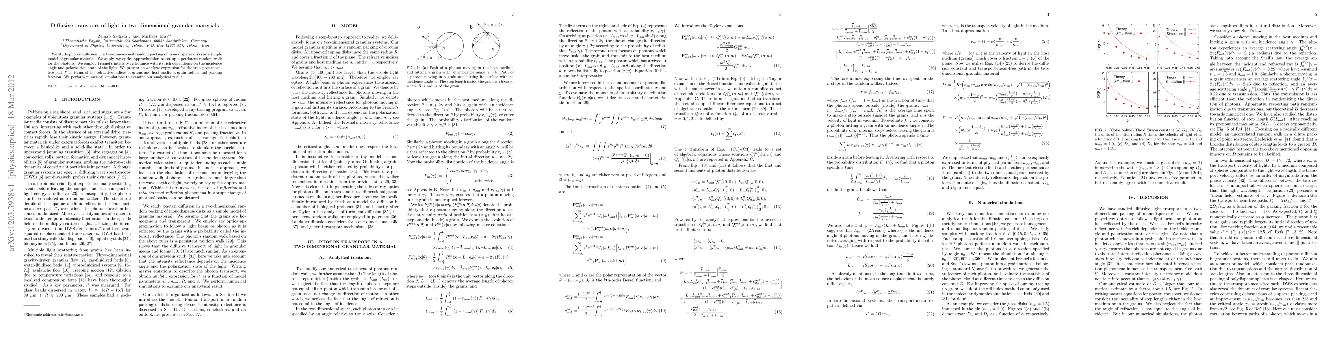 This paper investigates photon diffusion in two-dimensional granular materials using a model of random disk packing. It derives an analytic expression for the transport-mean-free path based on grain and medium properties, and validates it through numerical simulations.
