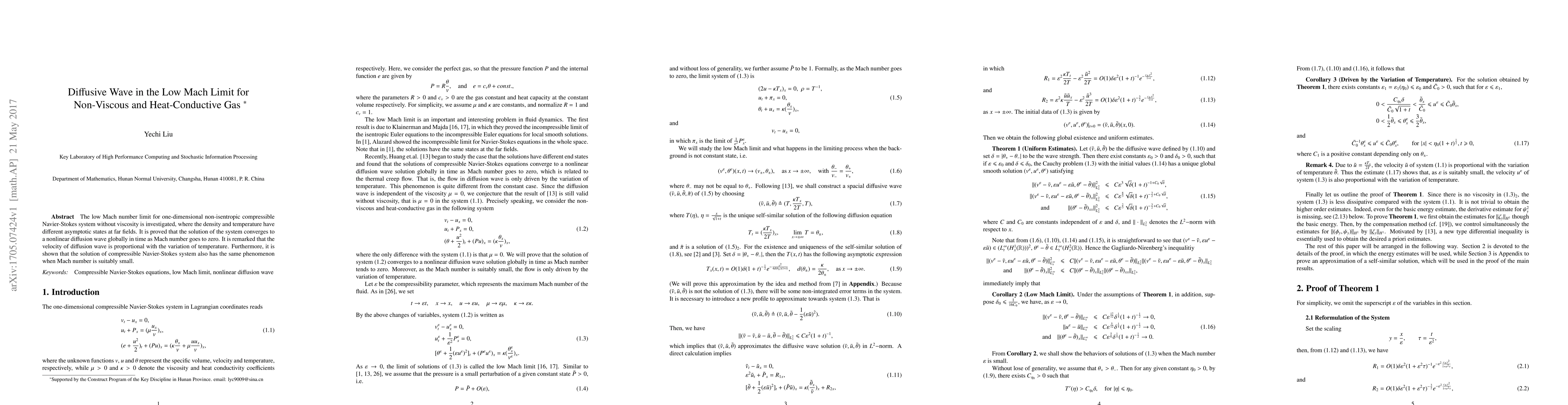 This paper investigates the low Mach number limit of a one-dimensional non-viscous, heat-conductive Navier-Stokes system, proving that the solution converges to a nonlinear diffusion wave as Mach number approaches zero. The velocity of the diffusion wave is shown to be proportional to the temperature variation.