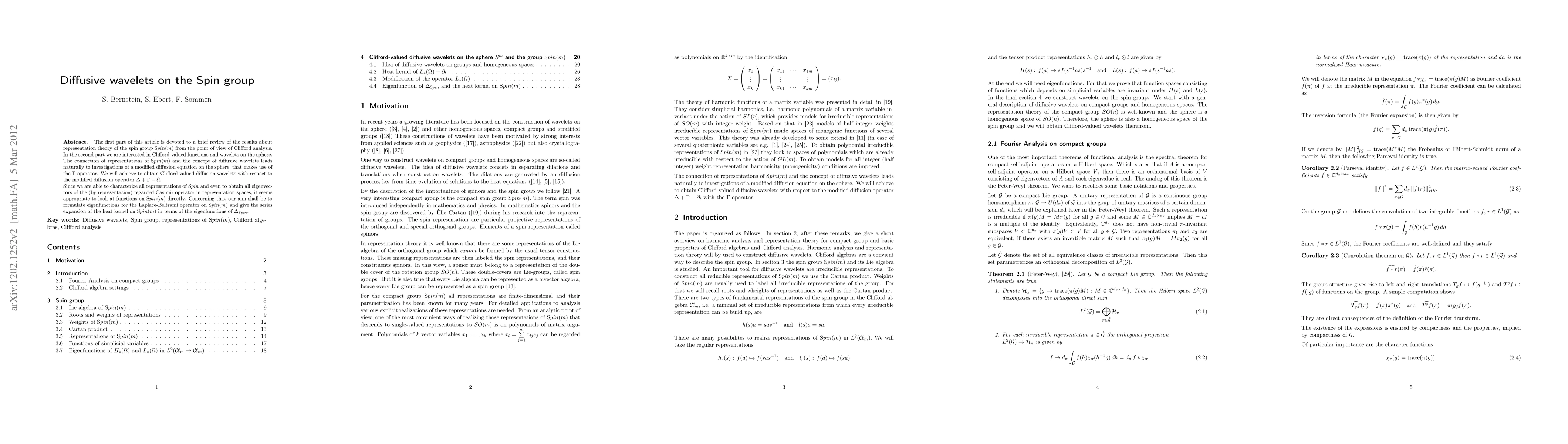 This paper explores diffusive wavelets on the spin group, focusing on representing functions on Spin(m) using Clifford-valued diffusion operators. It aims to formulate eigenfunctions for the Laplace-Beltrami operator and series expansion of the heat kernel on Spin(m).