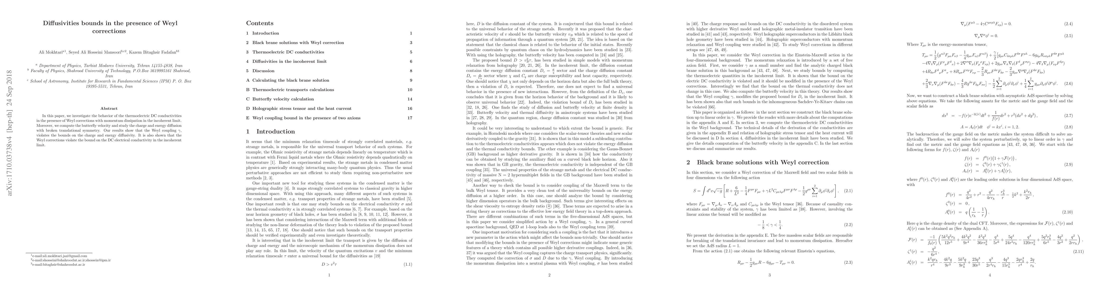 In this paper, we investigate the behavior of the thermoelectric DC conductivities in the presence of Weyl corrections with momentum dissipation in the incoherent limit. Moreover, we compute the butterfly velocity and study the charge and energy diffusion with broken translational symmetry. Our results show that the Weyl coupling $\gamma$, violates the bounds on the charge and energy diffusivity. It is also shown that the Weyl corrections violate the bound on the DC electrical conductivity in the incoherent limit.