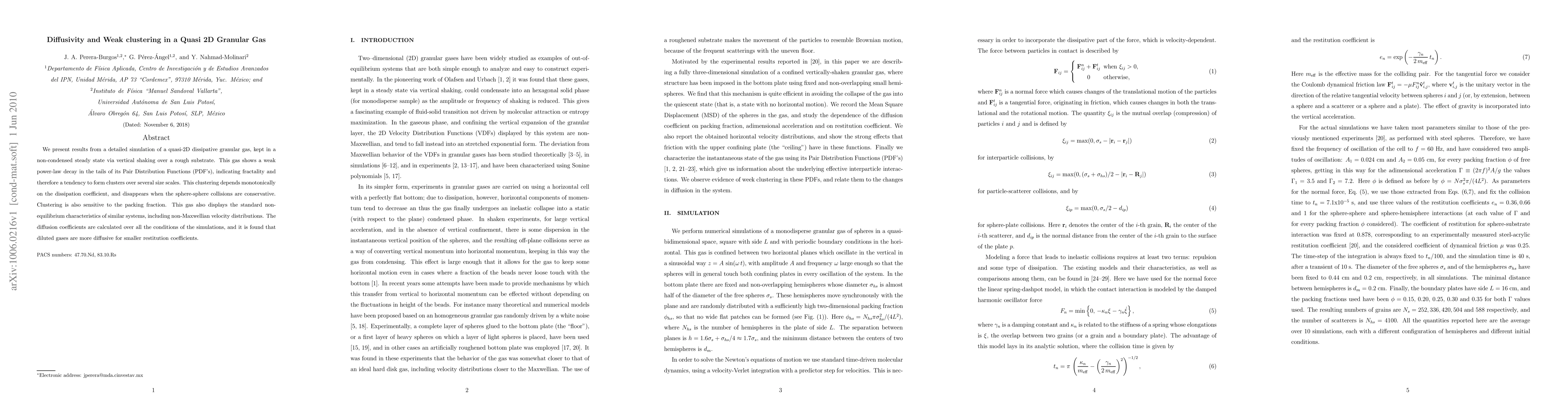 This study simulates a quasi-2D granular gas maintained via vertical shaking, revealing weak clustering and fractal tendencies in its Pair Distribution Functions. The clustering is influenced by the dissipation coefficient and packing fraction, while diffusion coefficients show higher diffusivity in diluted gases with lower restitution coefficients.