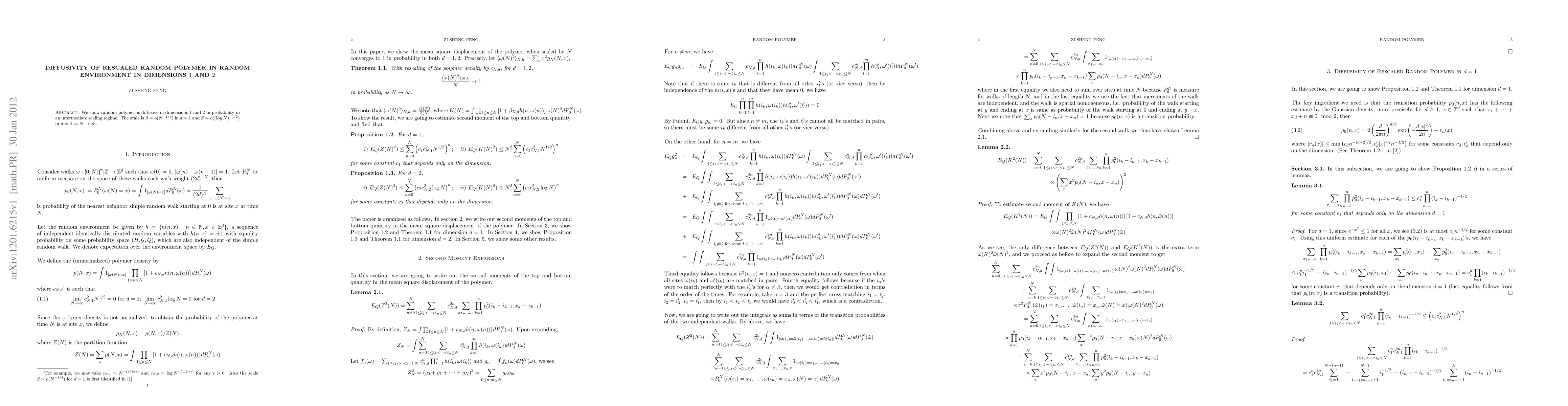 We show random polymer is diffusive in dimensions 1 and 2 in probability in an intermediate scaling regime. The scale is $\beta= o(N^{-1/4})$ in d=1 and $\beta=o((\log N)^{-1/2})$ in $d=2$ as $N\rightarrow \infty$.