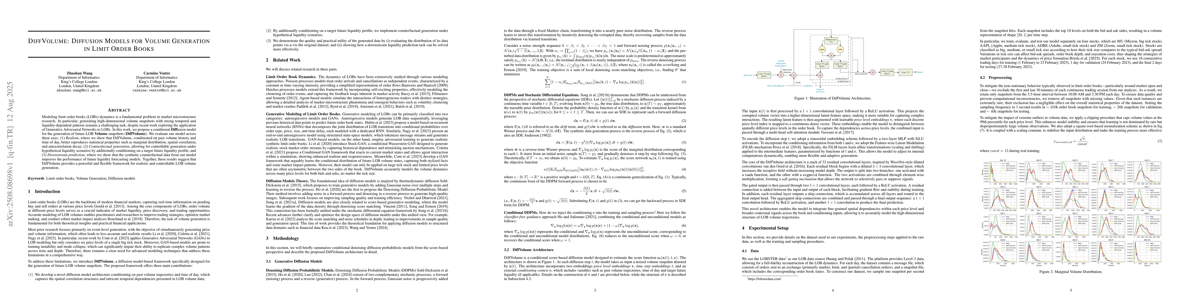 Modeling limit order books (LOBs) dynamics is a fundamental problem in market microstructure research. In particular, generating high-dimensional volume snapshots with strong temporal and liquidity-dependent patterns remains a challenging task, despite recent work exploring the application of Generative Adversarial Networks to LOBs. In this work, we propose a conditional \textbf{Diff}usion model for the generation of future LOB \textbf{Volume} snapshots (\textbf{DiffVolume}). We evaluate our model across three axes: (1) \textit{Realism}, where we show that DiffVolume, conditioned on past volume history and time of day, better reproduces statistical properties such as marginal distribution, spatial correlation, and autocorrelation decay; (2) \textit{Counterfactual generation}, allowing for controllable generation under hypothetical liquidity scenarios by additionally conditioning on a target future liquidity profile; and (3) \textit{Downstream prediction}, where we show that the synthetic counterfactual data from our model improves the performance of future liquidity forecasting models. Together, these results suggest that DiffVolume provides a powerful and flexible framework for realistic and controllable LOB volume generation.