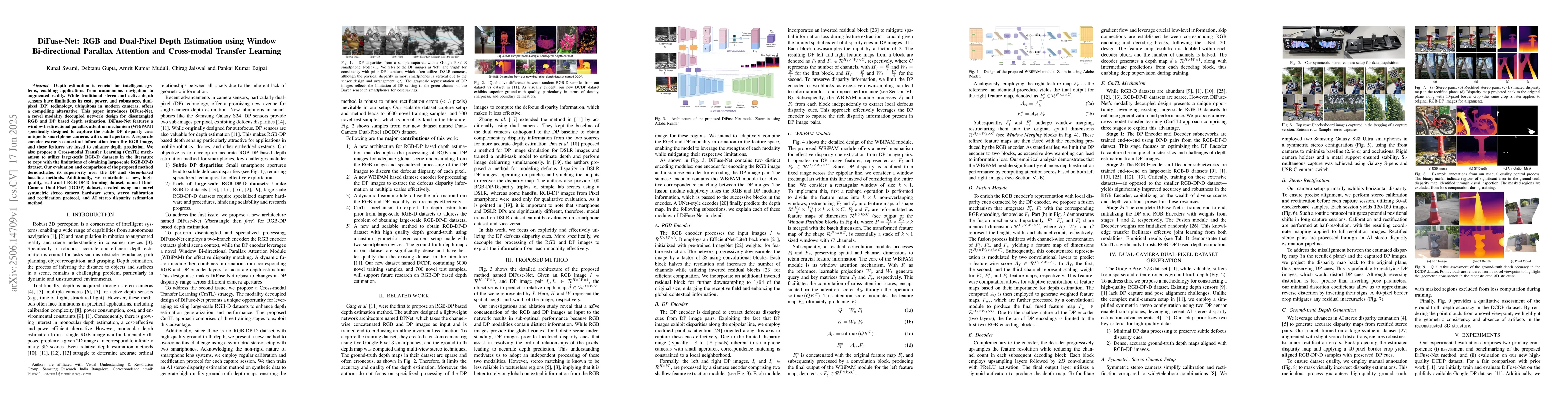 Depth estimation is crucial for intelligent systems, enabling applications from autonomous navigation to augmented reality. While traditional stereo and active depth sensors have limitations in cost, power, and robustness, dual-pixel (DP) technology, ubiquitous in modern cameras, offers a compelling alternative. This paper introduces DiFuse-Net, a novel modality decoupled network design for disentangled RGB and DP based depth estimation. DiFuse-Net features a window bi-directional parallax attention mechanism (WBiPAM) specifically designed to capture the subtle DP disparity cues unique to smartphone cameras with small aperture. A separate encoder extracts contextual information from the RGB image, and these features are fused to enhance depth prediction. We also propose a Cross-modal Transfer Learning (CmTL) mechanism to utilize large-scale RGB-D datasets in the literature to cope with the limitations of obtaining large-scale RGB-DP-D dataset. Our evaluation and comparison of the proposed method demonstrates its superiority over the DP and stereo-based baseline methods. Additionally, we contribute a new, high-quality, real-world RGB-DP-D training dataset, named Dual-Camera Dual-Pixel (DCDP) dataset, created using our novel symmetric stereo camera hardware setup, stereo calibration and rectification protocol, and AI stereo disparity estimation method.