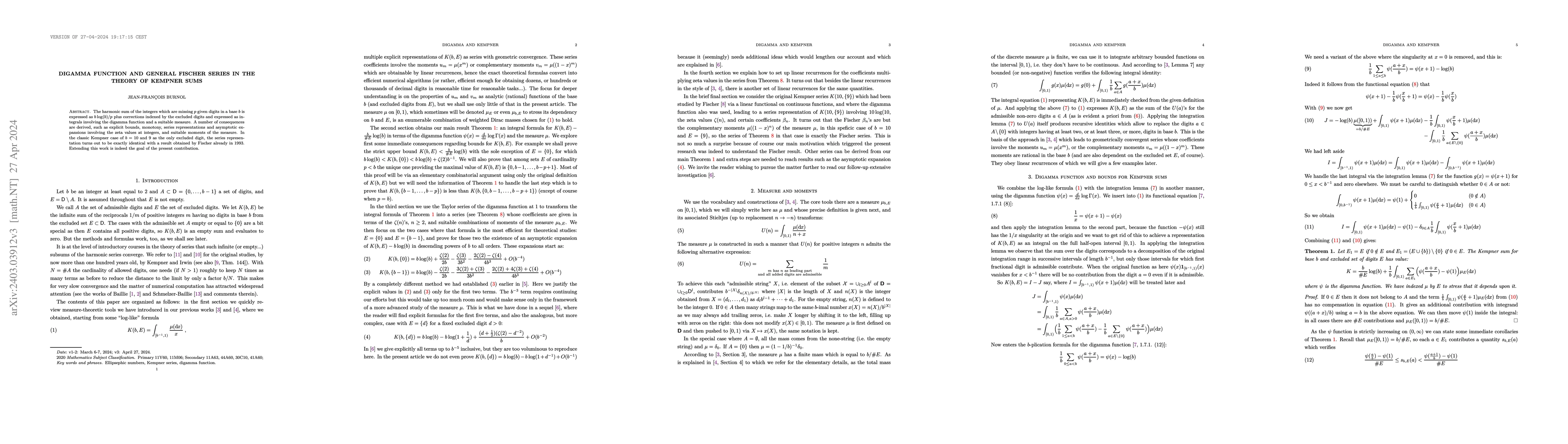 This paper explores the relationship between Kempner sums and harmonic series, using the digamma function and Fischer series to derive bounds, monotonicity properties, and asymptotic expansions. The key result extends Fischer’s 1993 finding for the classic Kempner case where 9 is the only excluded digit.