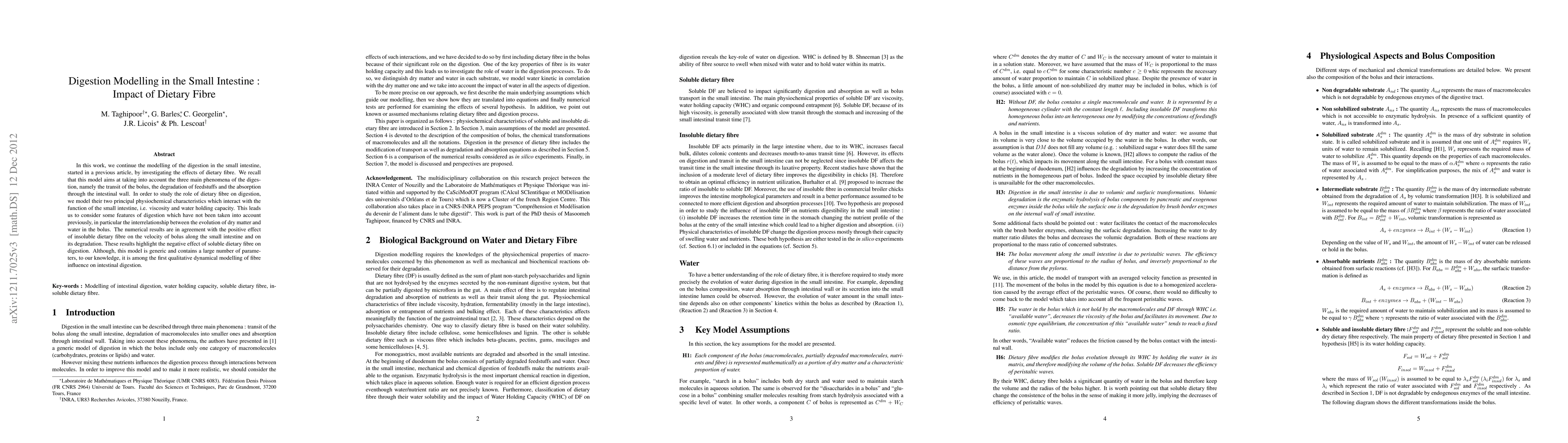 This study models digestion in the small intestine to investigate the impact of dietary fibre on digestive phenomena such as bolus transit, degradation, and absorption. The results show that insoluble fibre improves digestion, while soluble fibre has a negative effect.