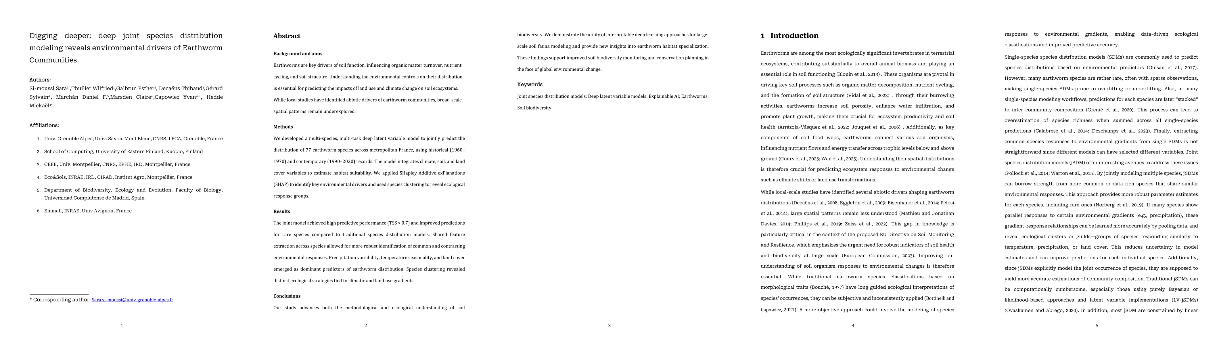 The research employs a deep learning model to predict the distribution of 77 earthworm species across France, considering climate, soil, and land cover variables. Key drivers of earthworm communities are found to be precipitation variability, temperature seasonality, and land cover, revealing distinct ecological strategies tied to climatic and land use gradients. This study advances soil biodiversity modeling and provides insights for conservation planning amid global environmental changes.