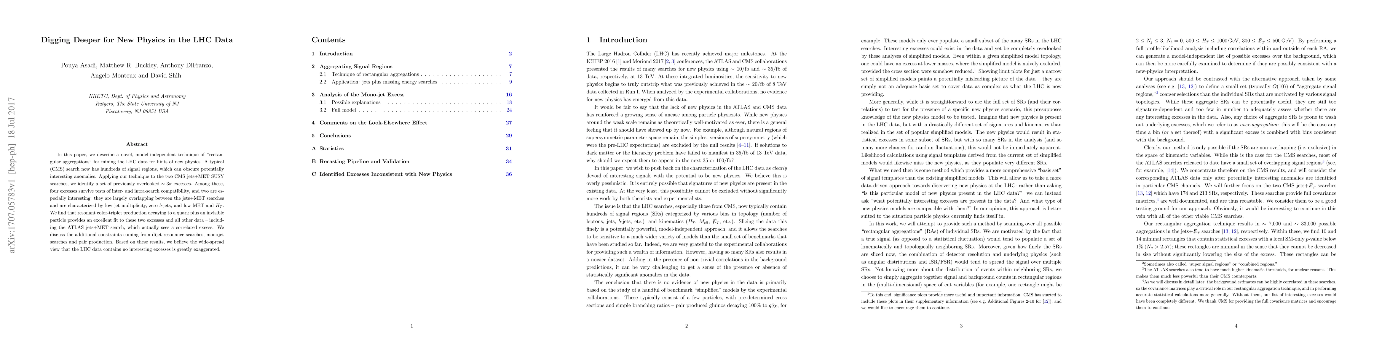 In this paper we describe a novel, model-independent technique of "rectangular aggregations" for mining the LHC data for hints of new physics. A typical (CMS) search now has hundreds of signal regions, which can obscure potentially interesting anomalies. Applying our technique to the two CMS jets+MET SUSY searches, we identify a set of previously overlooked $\sim 3\sigma$ excesses. Among these, four excesses survive tests of inter- and intra-search compatibility, and two are especially interesting: they are largely overlapping between the jets+MET searches and are characterized by low jet multiplicity, zero $b$-jets, and low MET and $H_T$. We find that resonant color-triplet production decaying to a quark plus an invisible particle provides an excellent fit to these two excesses and all other data -- including the ATLAS jets+MET search, which actually sees a correlated excess. We discuss the additional constraints coming from dijet resonance searches, monojet searches and pair production. Based on these results, we believe the wide-spread view that the LHC data contains no interesting excesses is greatly exaggerated.