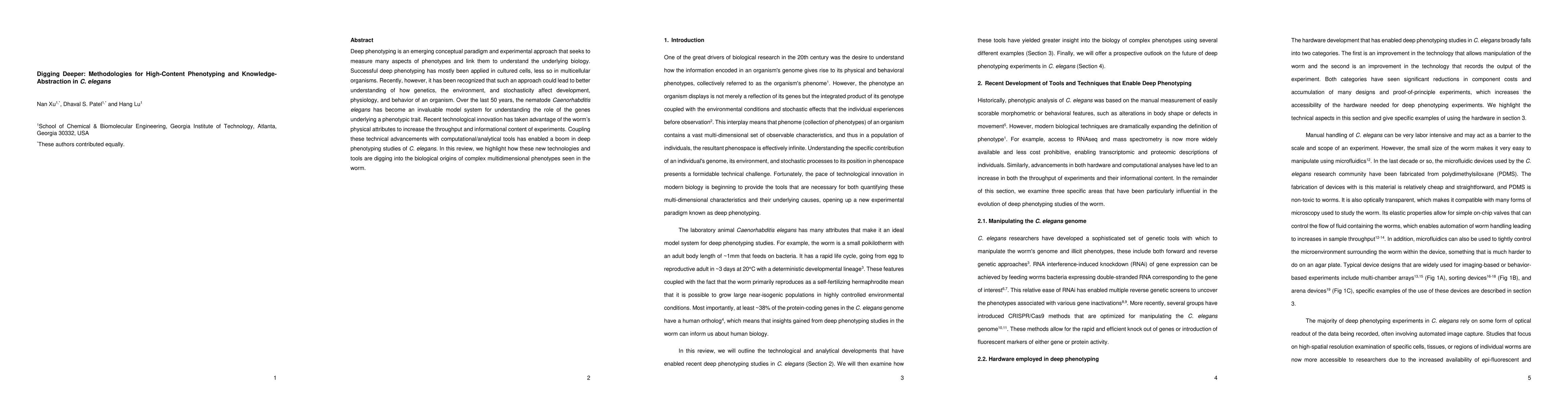This review highlights how new technologies and tools enable deep phenotyping in Caenorhabitis elegans, uncovering complex biological origins of worm traits. It discusses advancements in C. elegans research, including increased throughput and informational content of experiments.