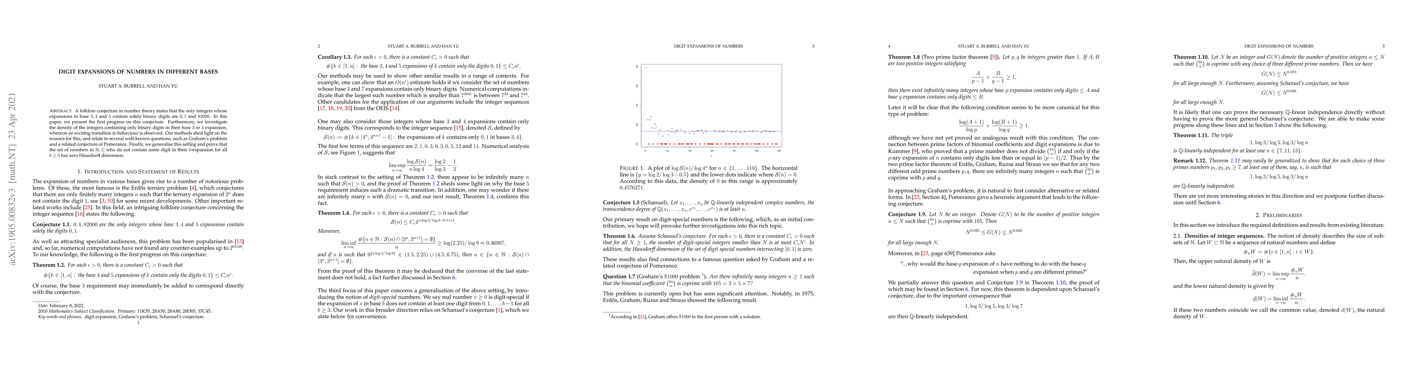 A folklore conjecture in number theory states that the only integers whose expansions in base $3,4$ and $5$ contain solely binary digits are $0, 1$ and $82000$. In this paper, we present the first progress on this conjecture. Furthermore, we investigate the density of the integers containing only binary digits in their base $3$ or $4$ expansion, whereon an exciting transition in behaviour is observed. Our methods shed light on the reasons for this, and relate to several well-known questions, such as Graham's problem and a related conjecture of Pomerance. Finally, we generalise this setting and prove that the set of numbers in $[0, 1]$ who do not contain some digit in their $b$-expansion for all $b \geq 3$ has zero Hausdorff dimension.