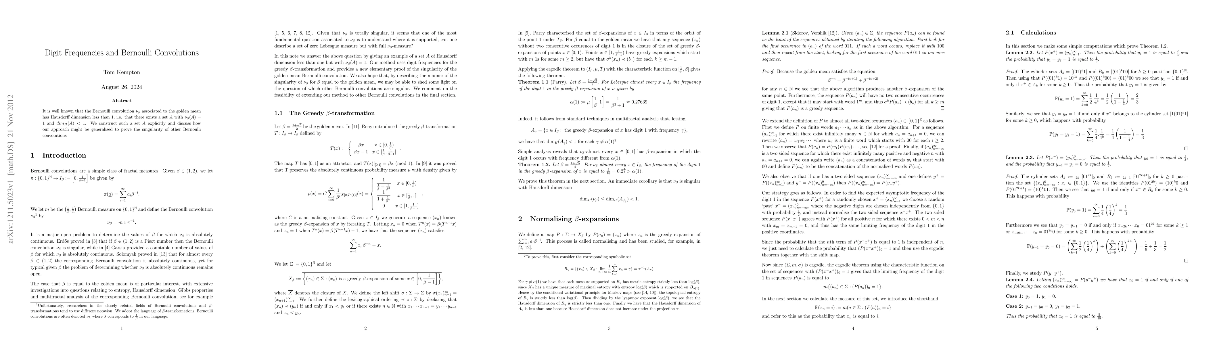 This paper constructs an explicit set $A$ for the Bernoulli convolution associated with the golden mean, demonstrating its Hausdorff dimension is less than 1. The authors discuss potential generalizations for proving the singularity of other Bernoulli convolutions.