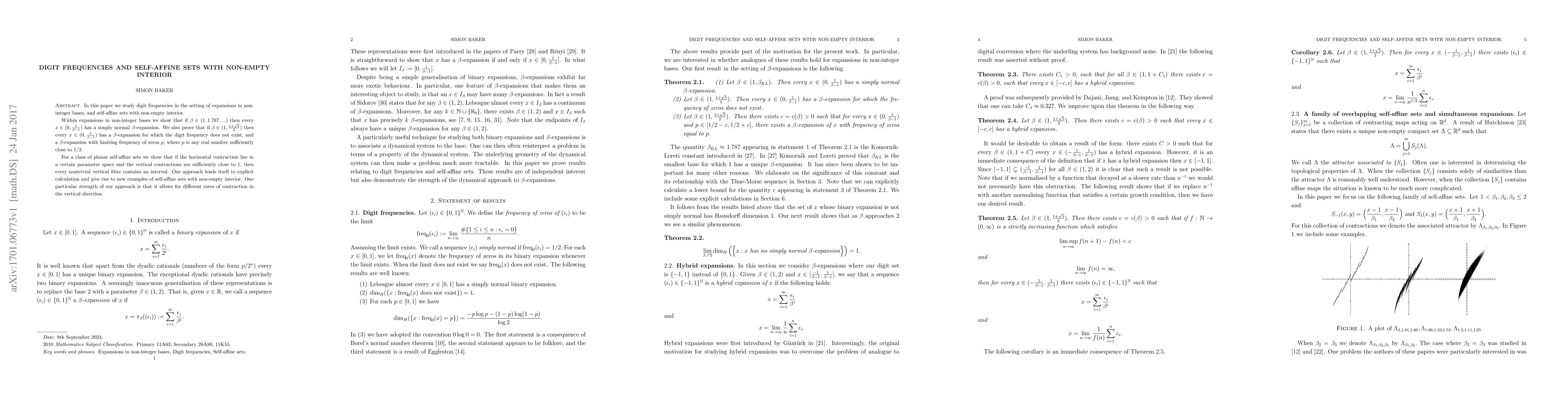 This paper explores digit frequencies in non-integer base expansions and self-affine sets with non-empty interiors, proving that certain bases yield simply normal expansions while others exhibit digit frequency anomalies, and demonstrating that self-affine sets can contain intervals under specific contraction conditions.