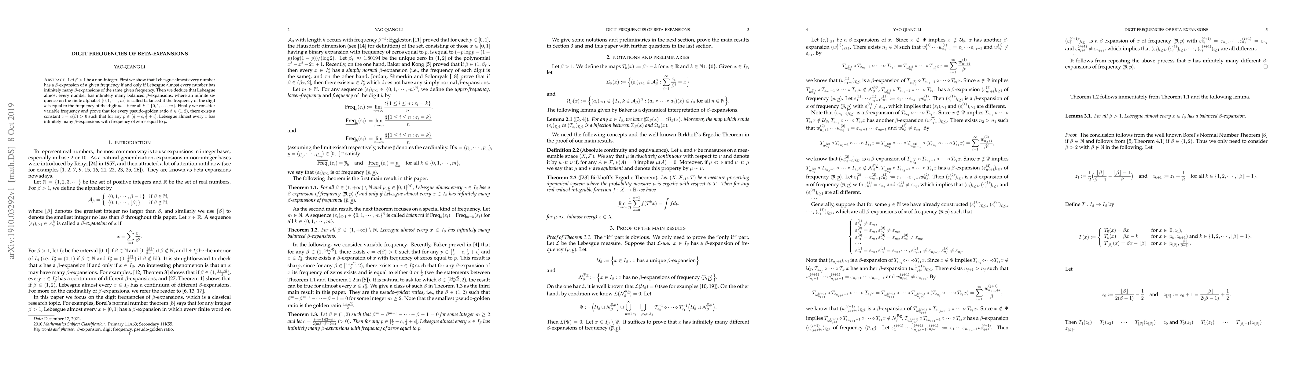 Let $\beta>1$ be a non-integer. First we show that Lebesgue almost every number has a $\beta$-expansion of a given frequency if and only if Lebesgue almost every number has infinitely many $\beta$-expansions of the same given frequency. Then we deduce that Lebesgue almost every number has infinitely many balanced $\beta$-expansions, where an infinite sequence on the finite alphabet $\{0,1,\cdots,m\}$ is called balanced if the frequency of the digit $k$ is equal to the frequency of the digit $m-k$ for all $k\in\{0,1,\cdots,m\}$. Finally we consider variable frequency and prove that for every pseudo-golden ratio $\beta\in(1,2)$, there exists a constant $c=c(\beta)>0$ such that for any $p\in[\frac{1}{2}-c,\frac{1}{2}+c]$, Lebesgue almost every $x$ has infinitely many $\beta$-expansions with frequency of zeros equal to $p$.