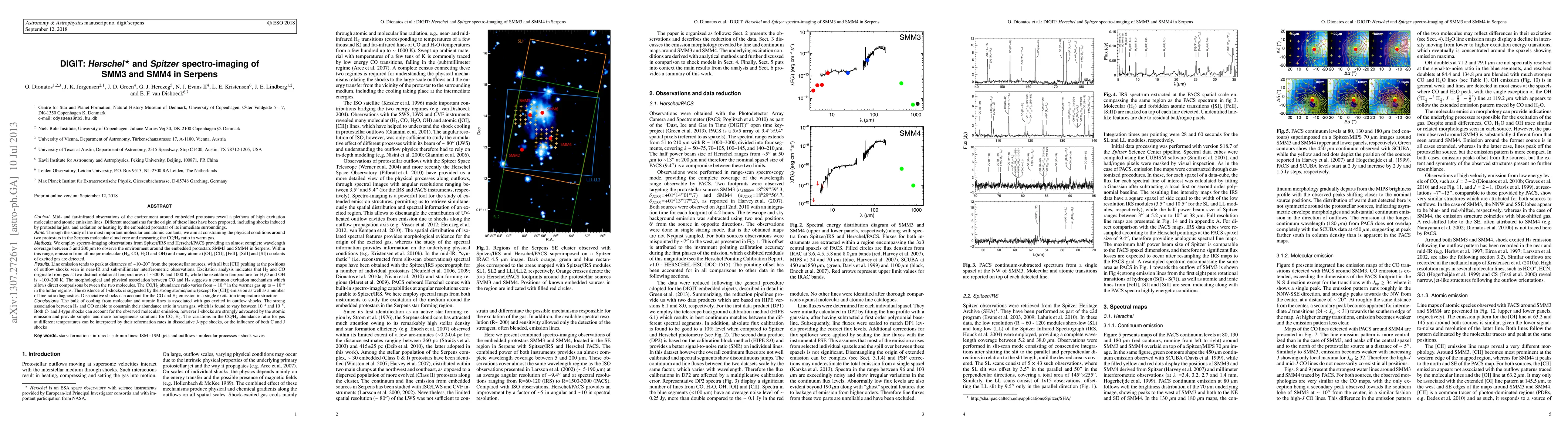 We report on spectro-imaging observations employing Spitzer IRS and Herschel PACS, aiming to constrain the physical conditions around SMM3 and SMM4 in Serpens. The combined power of both instruments provides an almost complete wavelength coverage between 5 and 200 micron at an angular resolution of 10". We detect line emission from all major molecular (H2, CO, H2O and OH) and many atomic ([OI], [CII], [FeII], [SiII] and [SI]) coolants. Line emission tends to peak at distances of 10 - 20" from the protostellar sources, at positions of known outflow shocks. The only exception is [CII] which likely traces a PDR excited from the neighboring source SMM6. Excitation analysis indicates that H2 and CO originate from gas at two distinct rotational temperatures of 300 K and 1000 K, while H2O and OH emission corresponds to rotational temperatures of 100 - 200 K. The morphological and physical association between CO and H2 suggests a common excitation mechanism which allows direct comparisons between the two molecules. The CO/H2 abundance ratio varies from 10^-5 in the warm gas up to 10^-4 in the hotter regions. The occurrence of J-shocks is suggested by the strong atomic/ionic (except for [CII]) emission as well as a number of line ratio diagnostics. Both C- and J-shocks can account for the observed molecular emission, however J-shocks are strongly advocated by the atomic emission and provide simpler and more homogeneous solutions for CO and H2. C-shocks describe better the emission from H2O and OH. The variations in the CO/H2 abundance ratio for gas at different temperatures can be interpreted by their reformation rates in dissociative J-type shocks, or the simultaneous influence of both C and J shocks.
